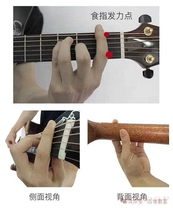 食指:横跨吉他颈,轻压于所有六根弦的第一品上,确保均匀受力,使每根弦都能清晰发声。