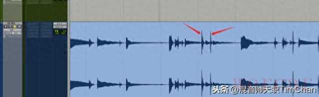 一般情况下,我们在混音的时候是一定会保留这个声音,没有这个声音会让人觉得吉他不是实录的。但是这种磨弦的声音很多时候又非常的尖锐,甚至声音录出来听着比弹的声音还要大,所以,我们都会想办法处理。这个是我最近混的一个工程里的吉他,很多这种高的地方都是磨弦的声音,非常烦人。