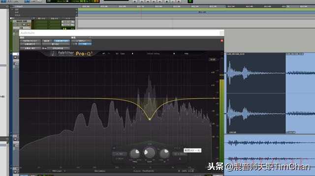 第二个方法,其实跟这个差不多,但是更加麻烦,就是,对这个切片,添加一个EQ或者是多段压缩或者动态EQ,然后把这个声音最刺耳的频段衰减下来。一般使用带有示波器的EQ可以直接看到哪个最刺耳,然后设置好Q值,一边听一边衰减,知道你听到这个声音变得柔和舒服。这个也是要一个一个去切开来整,因为每一下的刺耳声音可能都有所不同,所以只能是每个都自己看着调。不过我一般会选用这个方法更多,因为这样不会有太多音量上的变化,而声音听着也自然,又不会影响到原来的吉他声,也不会有过渡的音量差的不适感。但是,还是那句话,一首歌下来,切死人了。。。