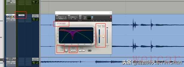 第三个方法,这个是最偷懒,最简便的,但是也有可能会吃掉同个频率的吉他的声音,就是直接给轨道上添加一个齿音消除器,因为齿音消除器其实也就是一个动态EQ或者是定点频段压缩器。这样的话,只要这个频段上的某个频段的增益超过阈值,就会被压下来。我们通过一个EQ找到这些磨弦声的一个主要的频段以后,在齿音消除器上选择bell的方式,再扫频到那个频段,我这里是2Khz左右。然后把阈值以及衰减范围设定好就可以自动帮你把这些磨弦声的最大声的频段打压下来。但是弊端是,如果吉他的声音有很多2Khz的好听的地方,也会相应地被打下来。不过这个适合用于作为bgm的吉他用,不用那么麻烦一个一个切。