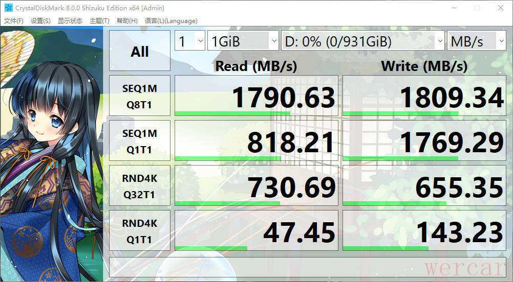 使用 Crystal Disk Mark 测试顺序读取速度1790MB/s,顺序写入速度1809MB/s,写入速度比标称值还要高100MB/s。4K 读取方面也达到了了730.69MB/s,随机写入速度655.35MB/s,性能方面表现还是不错的。