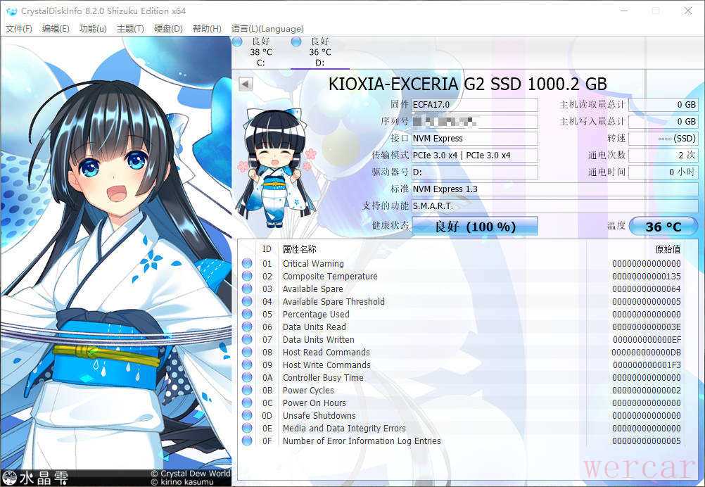 Crystal Disk Mark 可以正确识别到 PCIe 3.0 x4 以及 NVM Exress 1.3,主机读取和写入都为0GB,开机通电次数为2通电时间0小时,全新正品无疑。