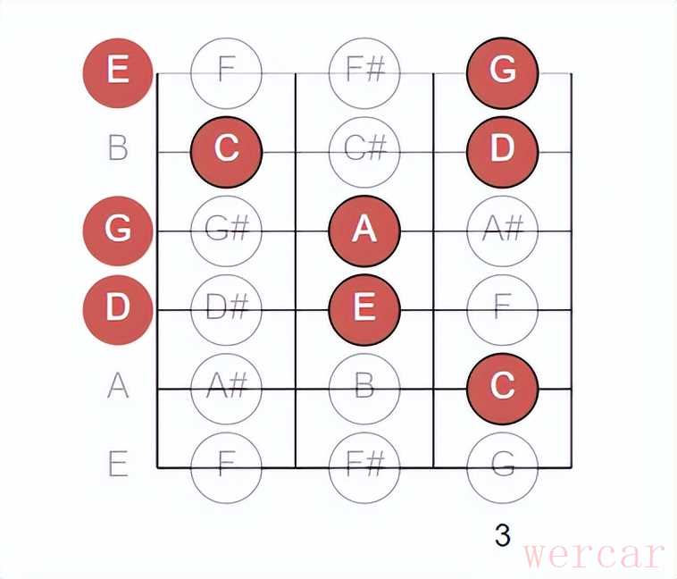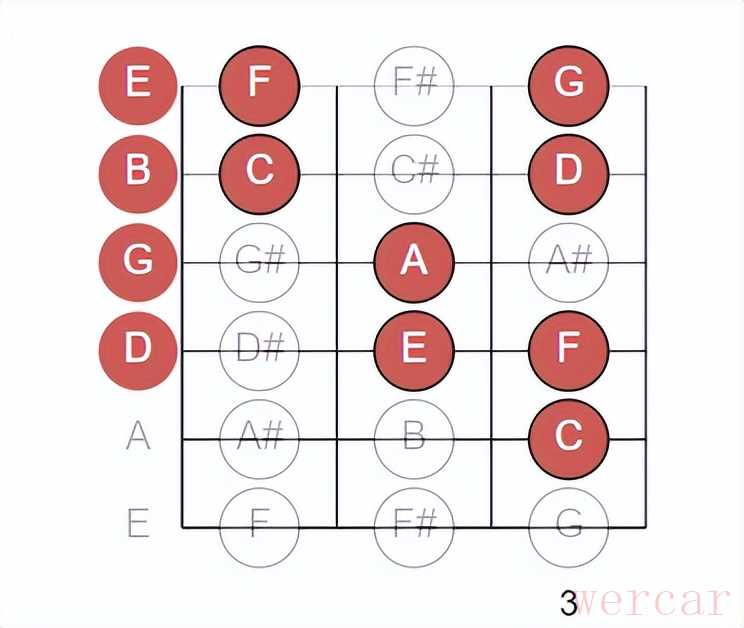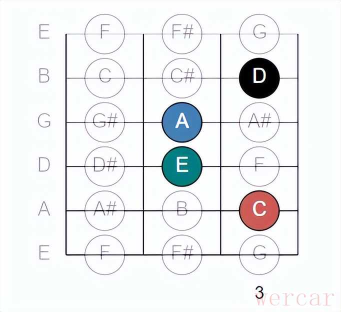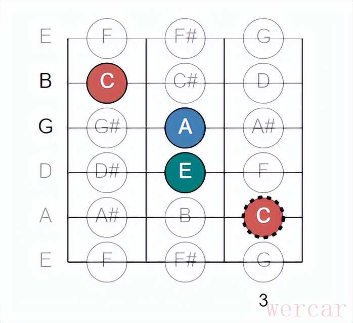 当你在C形位置演奏完一个和弦或旋律,往上移动一点点,就能无缝进入A形的区域。 - 视觉记忆: