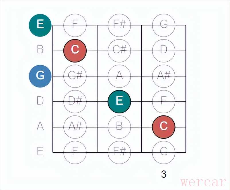 C形态是CAGED系统中最基础、最重要的形态之一,因为它直接对应了C大调的天然指板位置,并且为学习和应用其他CAGED形态(G, F, A, E)以及横按(Barre Chords)打下了坚实的基础。