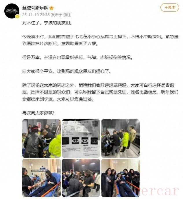 11月19日晚,@丝绒公路乐队 发文:当晚演出时,我们的吉他手毛毛不小心从舞台上摔下,不得不中断演出。紧急送到医院拍片诊断后,发现肋骨断了六根。