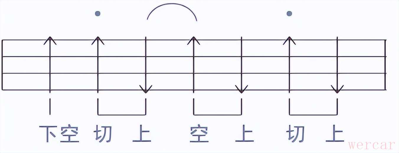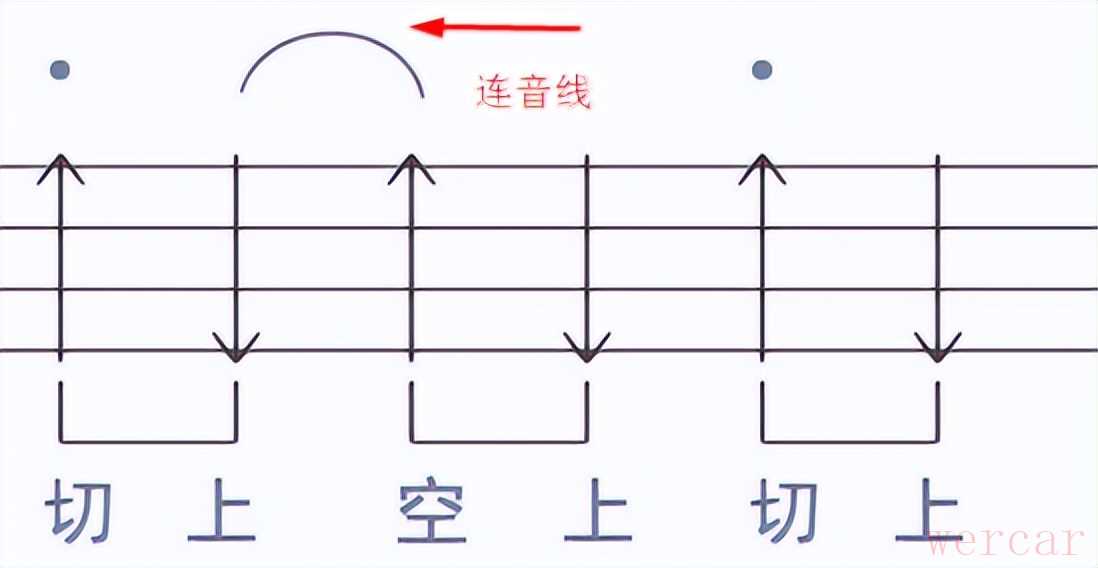琶音是最简单的,也是最好认的波浪线加一个箭头。琶音的弹奏是一般大拇指向下拨弦,食指向上拨弦,手指只需要匀速的波动它所覆盖的弦就可以了。