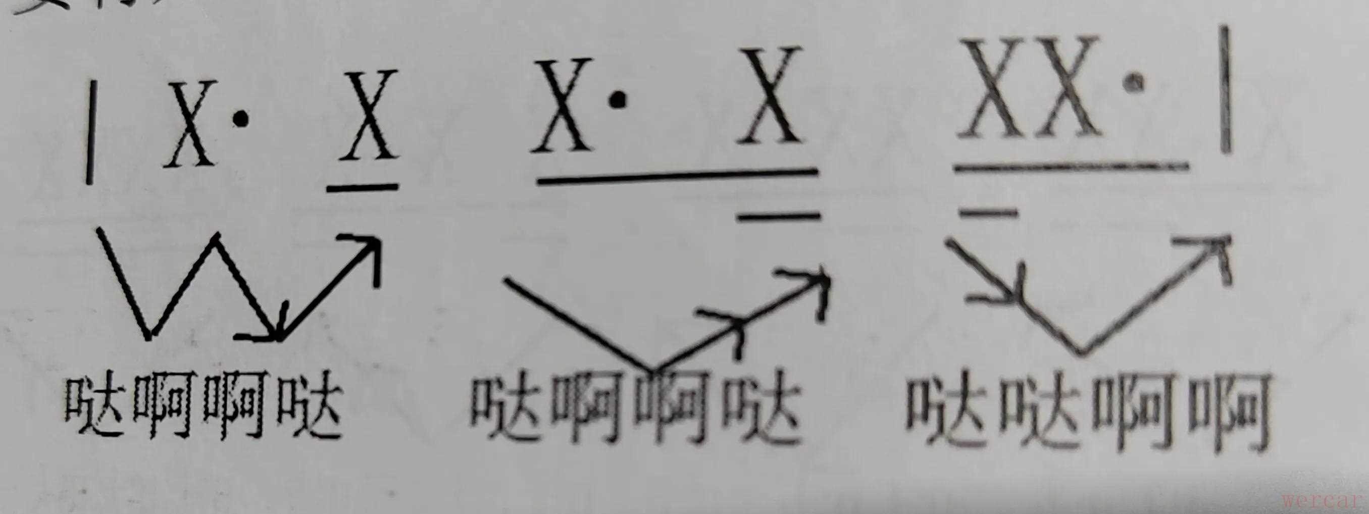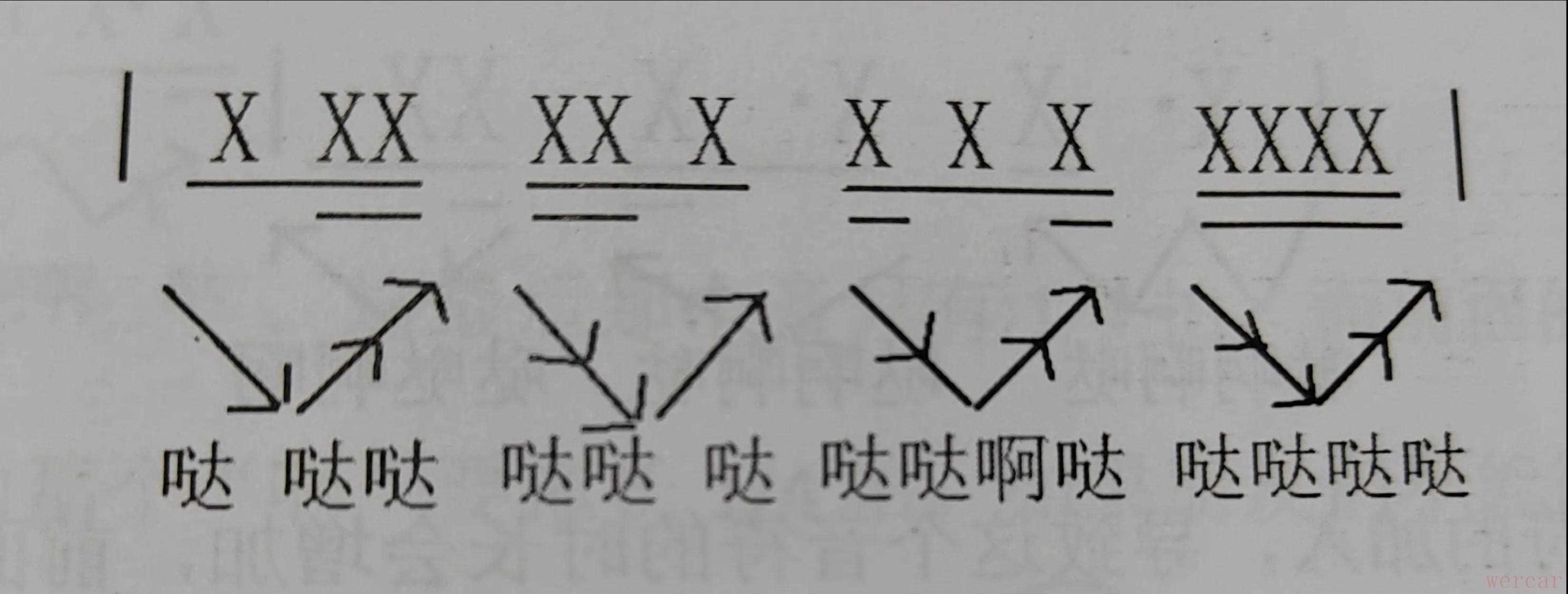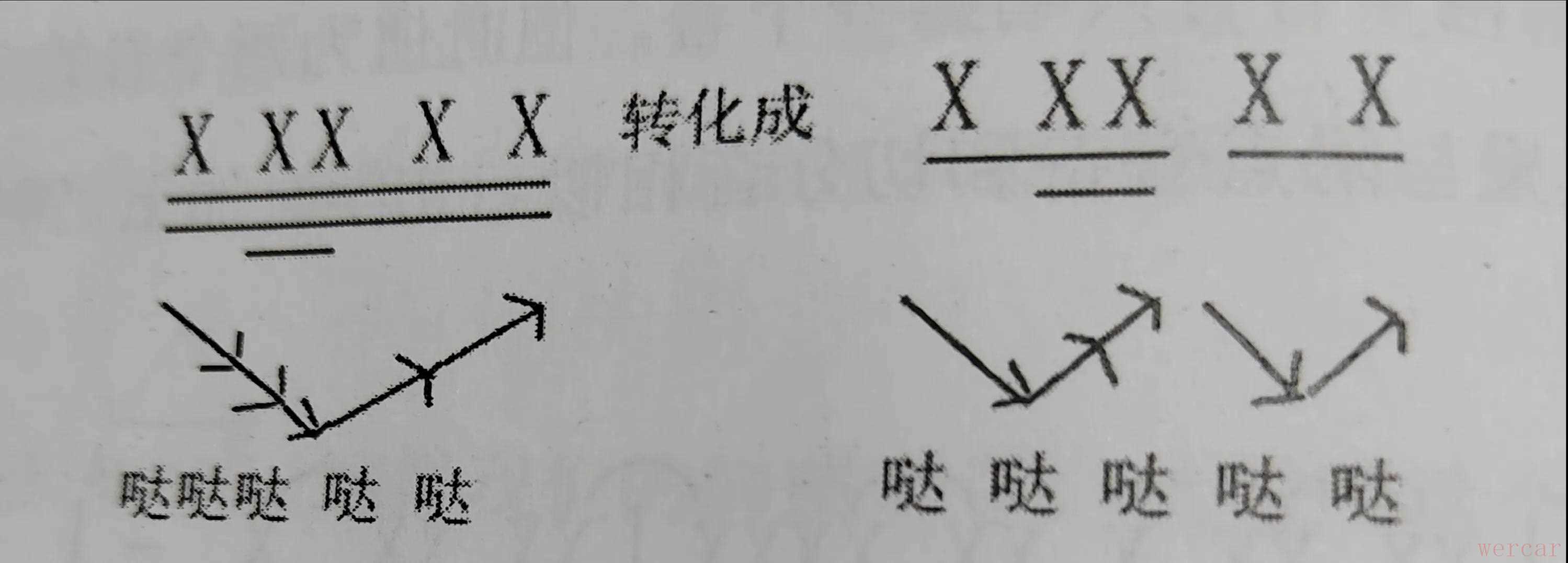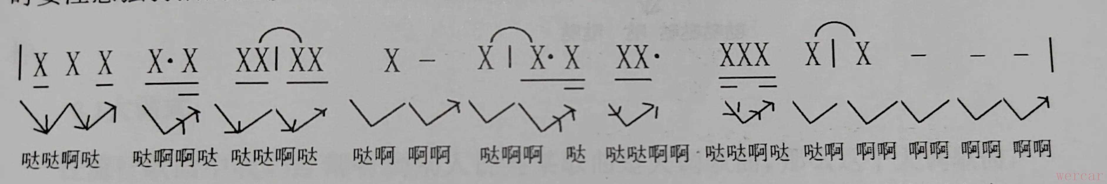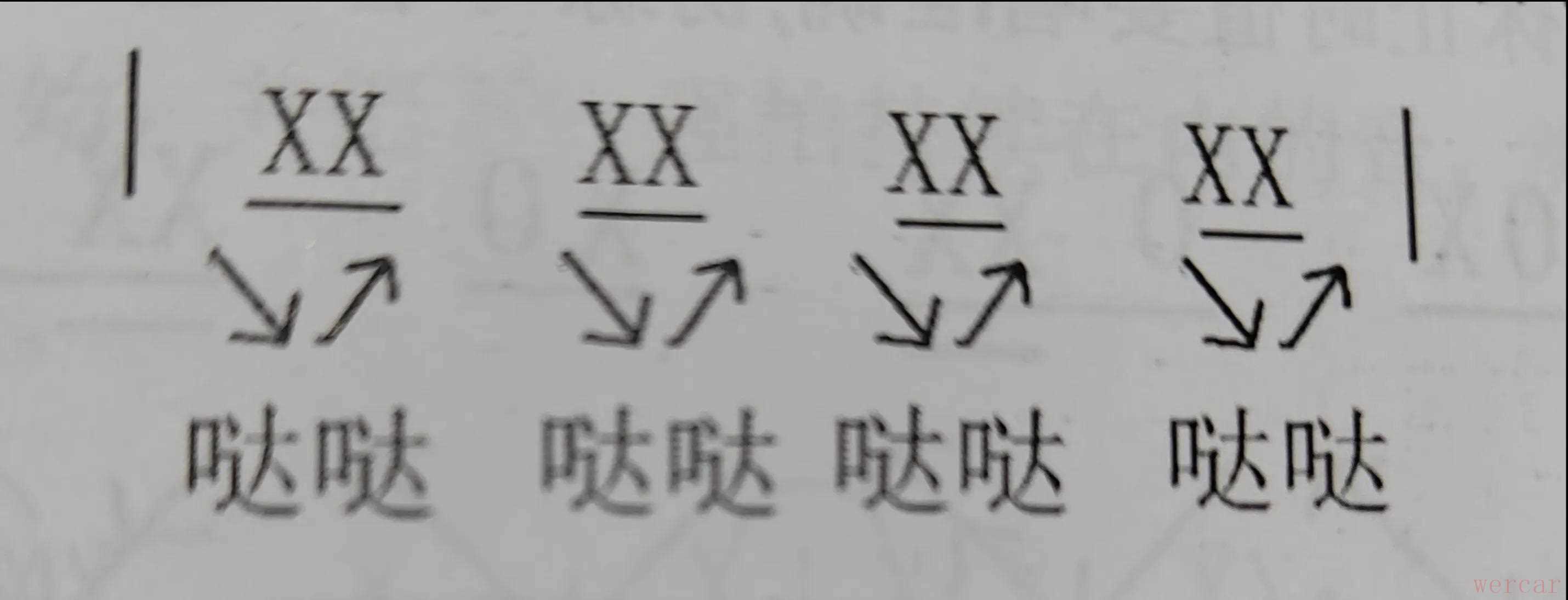 上图第三小节“哒哒 哒”可以分成四等份变成“哒哒啊哒”难度降低。