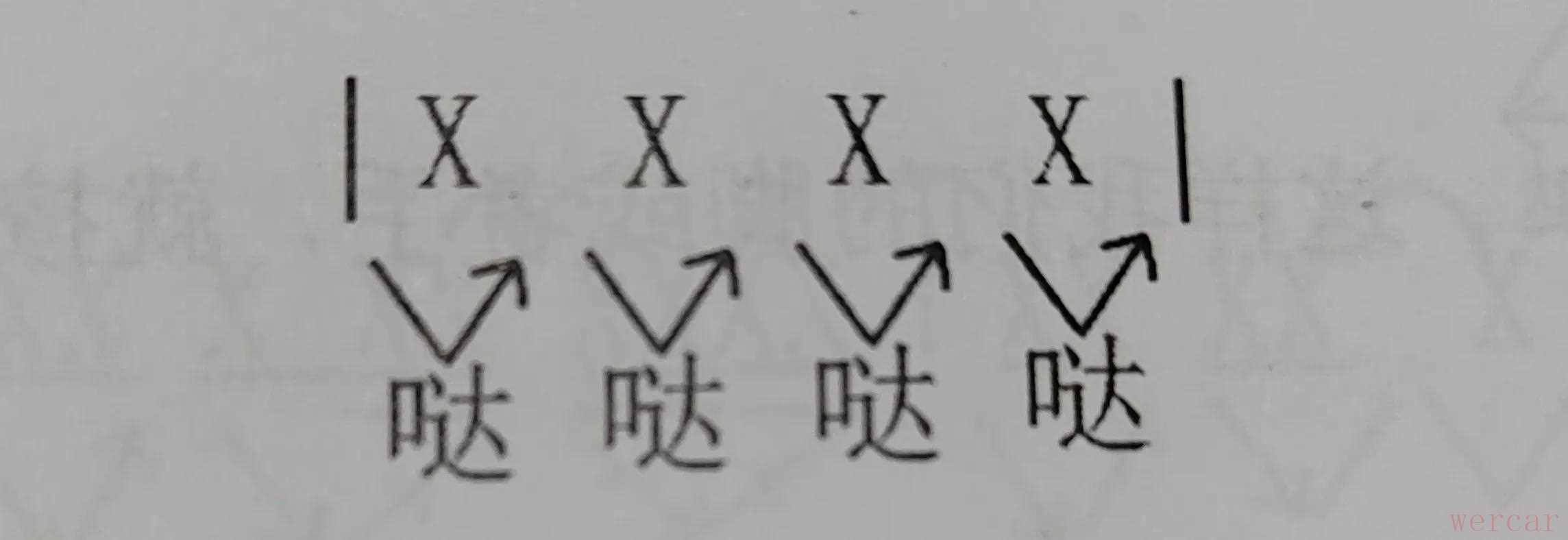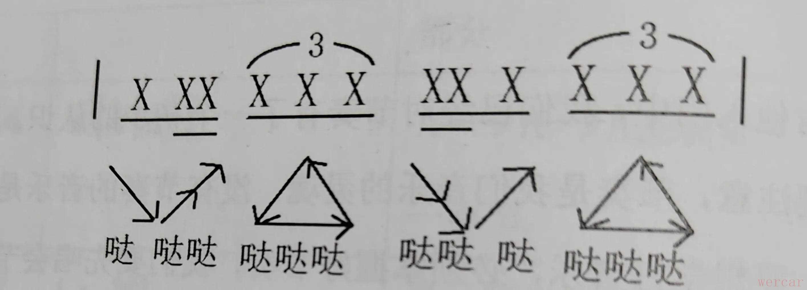 上图第2 、4拍的节奏就是三连音上面标弧线3 ,唱“哒哒哒”写成一个三角形,用手或脚按这个方向打出均等的时长。