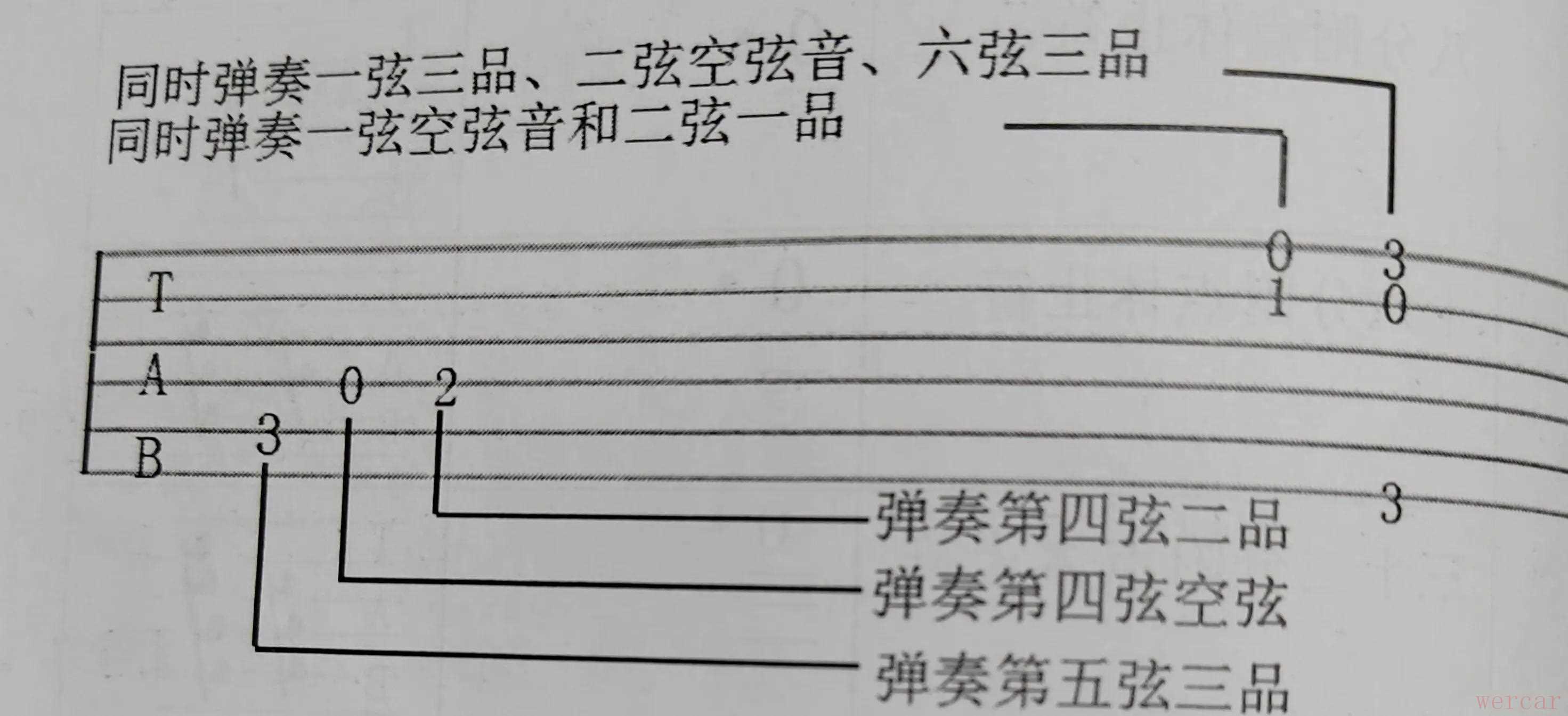 六线谱用数字表示音符所在的弦和品位。数字在第几弦的第几品位,左手手指就按在所在的弦的品位上,同时右手拨响所在的弦,空弦用0表示。不同弦上若干数字上下对齐时,表示几个音同时弹响,数字下方的竖线及横线表示音符的时值,时值的记法与简谱的时值记法相同。