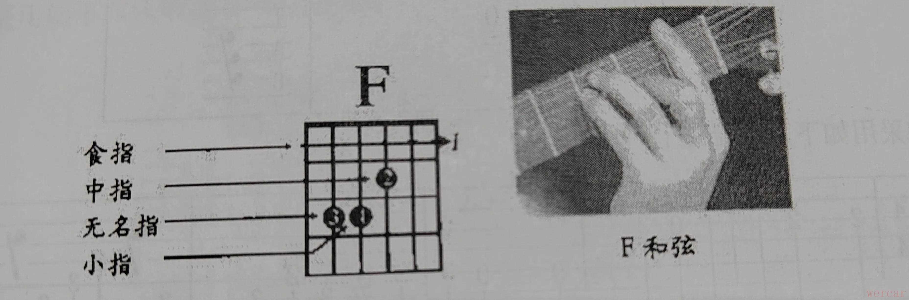 如出现大横按和弦图的品格用一个横向剪头数字表示,数字表示品格数如下图F和弦。
