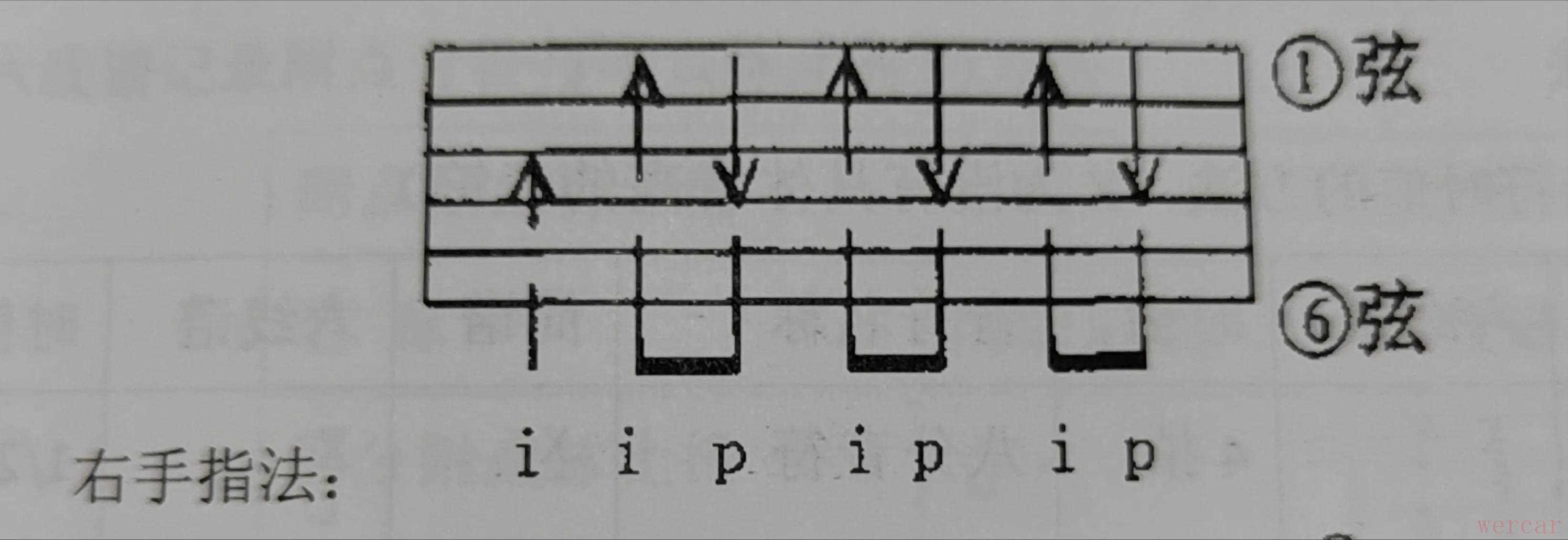 右手扫琴弦节奏型是在六线谱中用向上或向下的剪头标记的,剪头向上,表示右手从低音向高音扫弦,剪头向下,表示右手从高音弦向低音弦回扫。如下图。