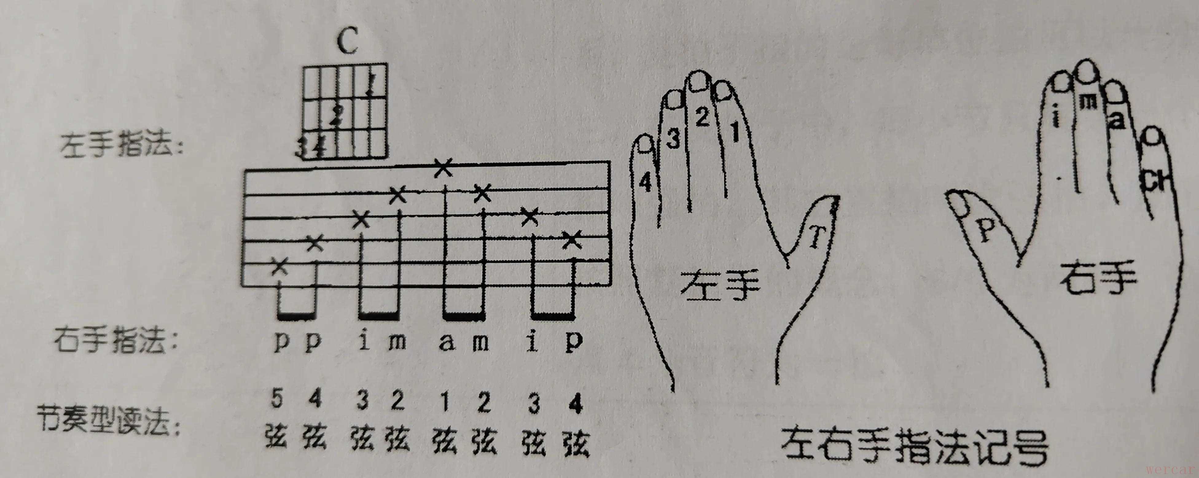 在六线谱中记录记录分解和弦节奏型时,要与和弦图相结合。右手的节奏指法用X表示,记在六线谱中不同线上,表示右手各指先后顺序与时值要求弹响带X的弦。