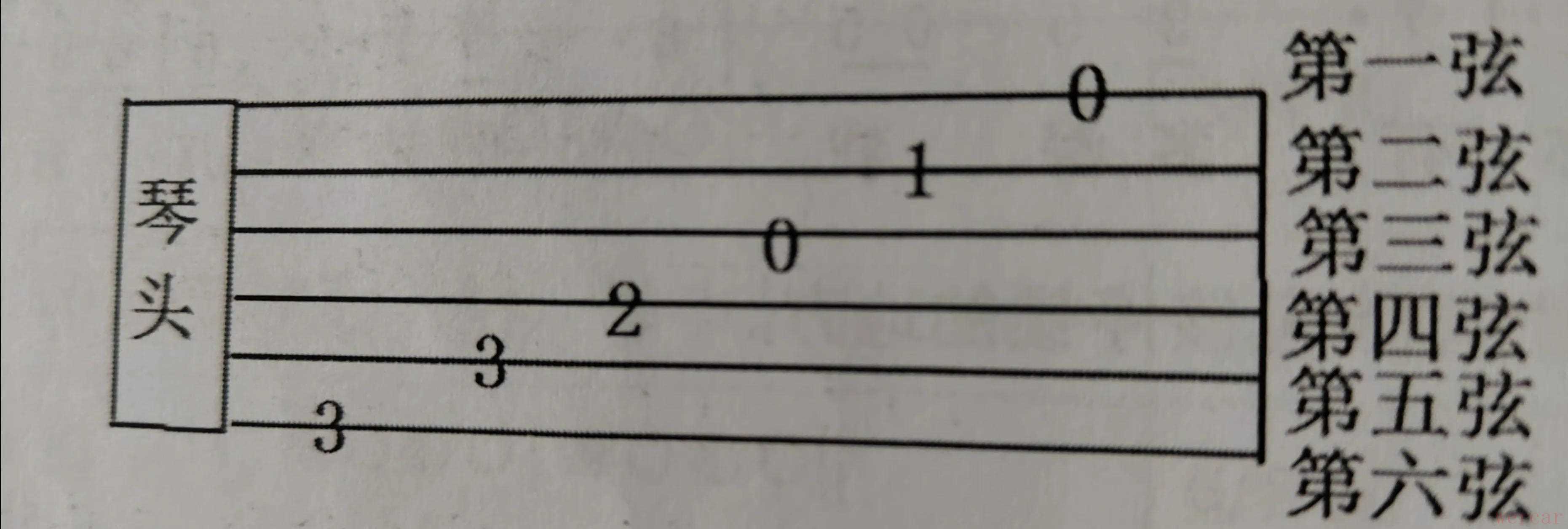 六线谱用数字表示音符所在的弦和品位。数字在第几弦的第几品位,左手手指就按在数字所在的弦和品位上,同时右手拨响数字所在的弦,弹奏空弦时用0表示,不同弦上若干个数字上下对齐时,表示这几个音同时弹响。