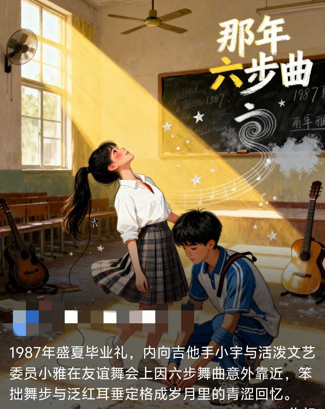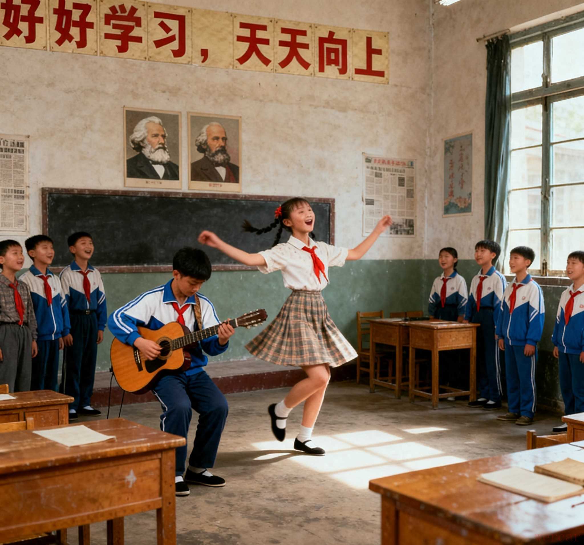 1987年的夏天是不是都这么黏糊?教室里的吊扇有气无力地转着,把粉笔灰和汗水味搅在一起。小雅的白衬衫领口已经洇出汗渍,她还在黑板上画着歪歪扭扭的音符,格子裙扫过讲台时带起的风,差点把小宇的乐谱吹跑。