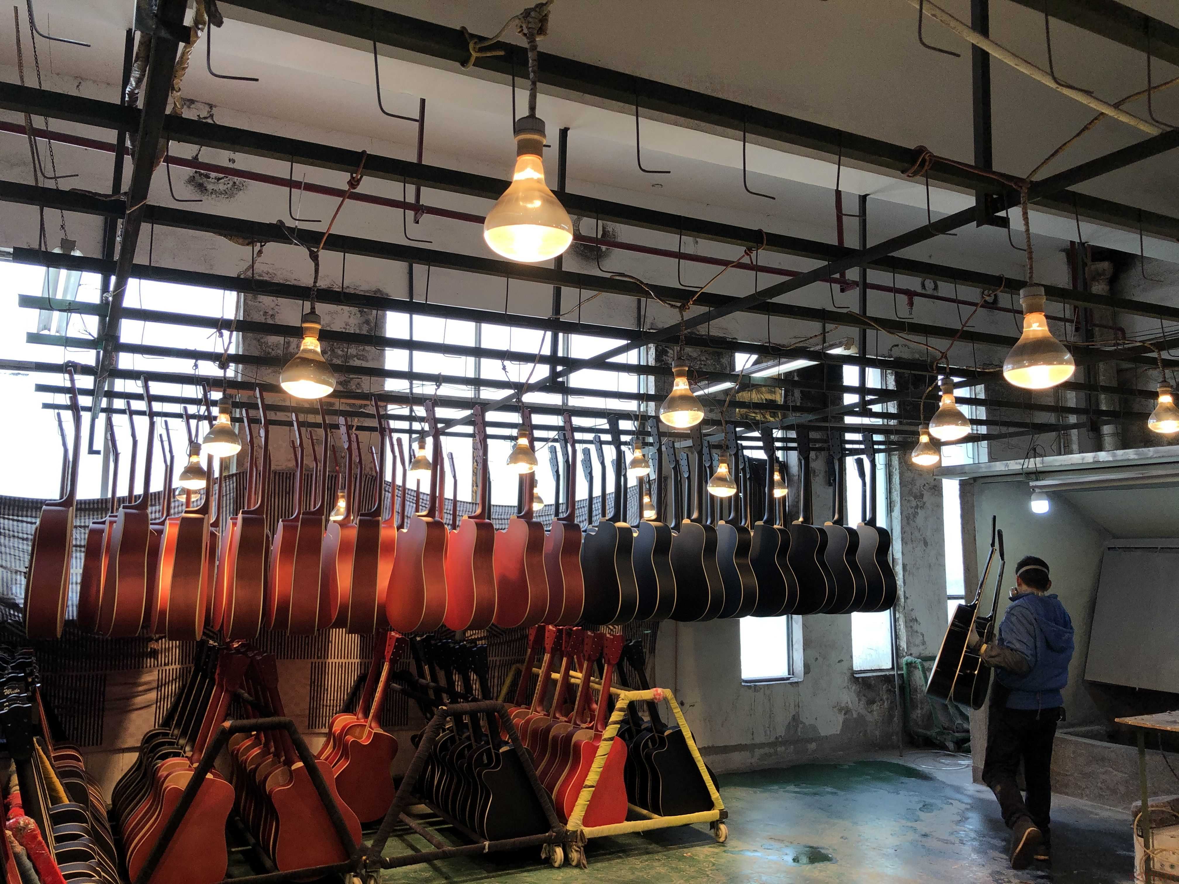 打磨、喷漆,原木色的琴身泛出光泽。几百把琴被挂在一个大开间内,由暖灯照射、烘干三小时,再送至下一个车间装配零件。