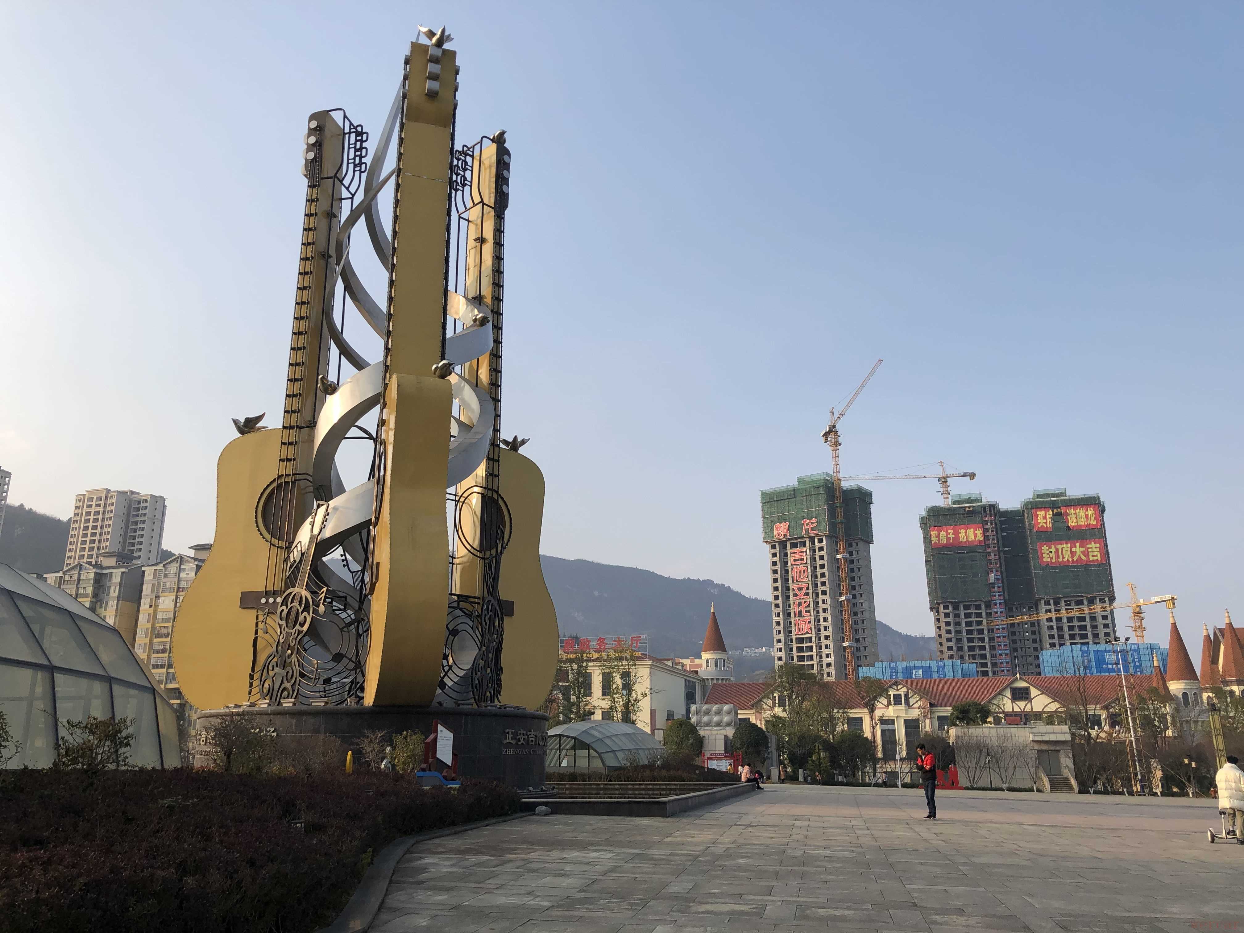 街道上随处可见吉他形状的摆饰,县人民政府政务大厅的牌匾下,亦有一座咖色的吉他浮雕;与之遥遥相对的,是一片巨大的“吉他广场”,广场中央,有一座十米多高的吉他雕像。