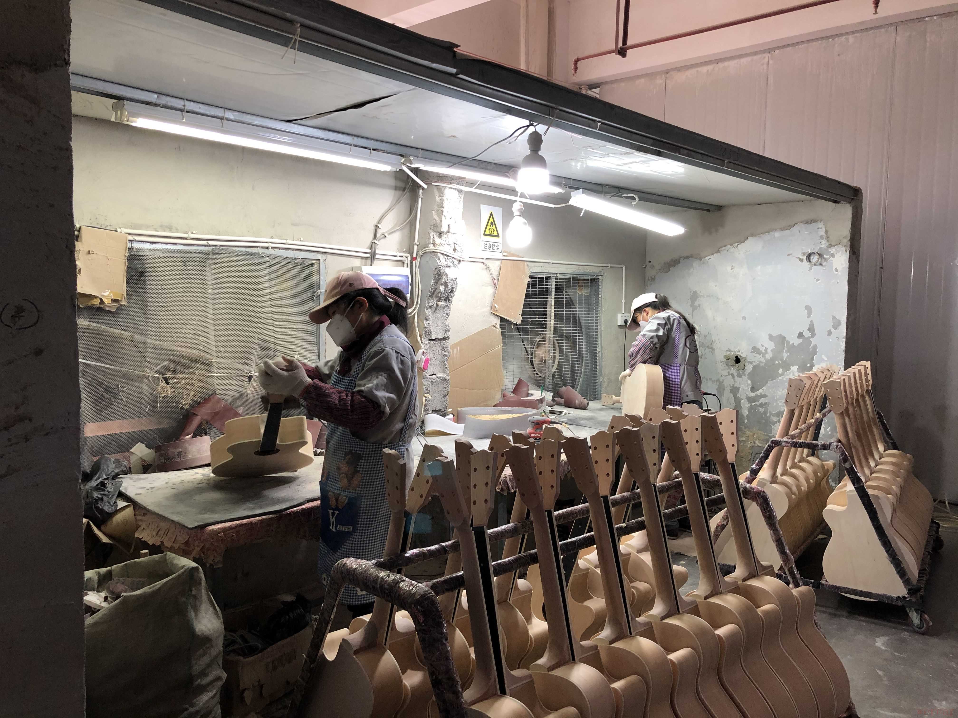 工人们在对吉他进行打磨。新京报记者 冯雨昕 摄