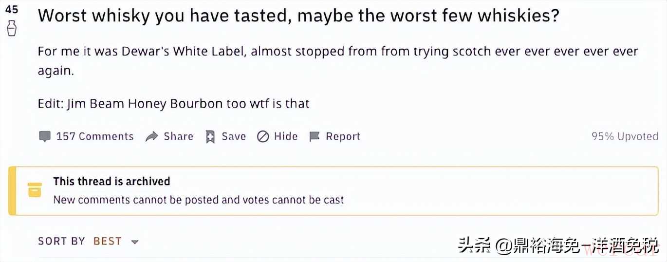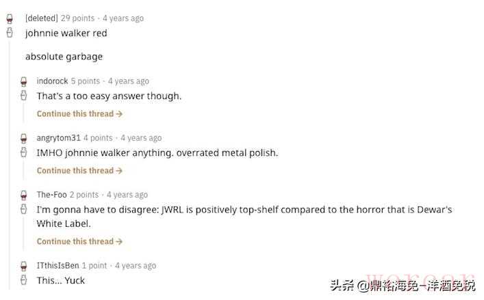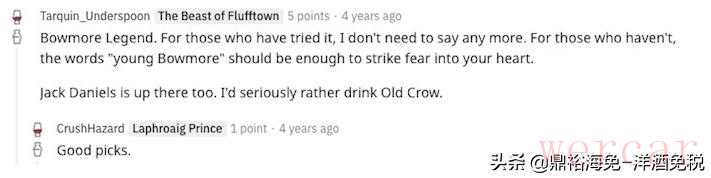 在美国访问量最大的社交论坛Reddit上,几年前有个热门贴“Worst whisky you have tasted”,回复区直接建起了高楼,讨论异常热烈,随便截几张给大家看看。