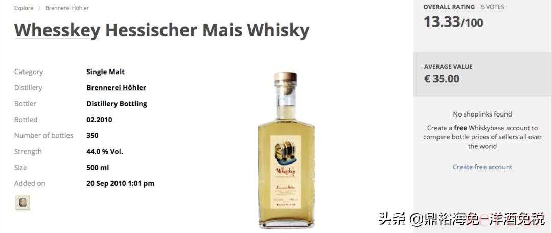 第二名是来自德国Brennerei Höhler酒厂的一款谷物威士忌,评论数量不多,我估计是无法作出评价的意思。