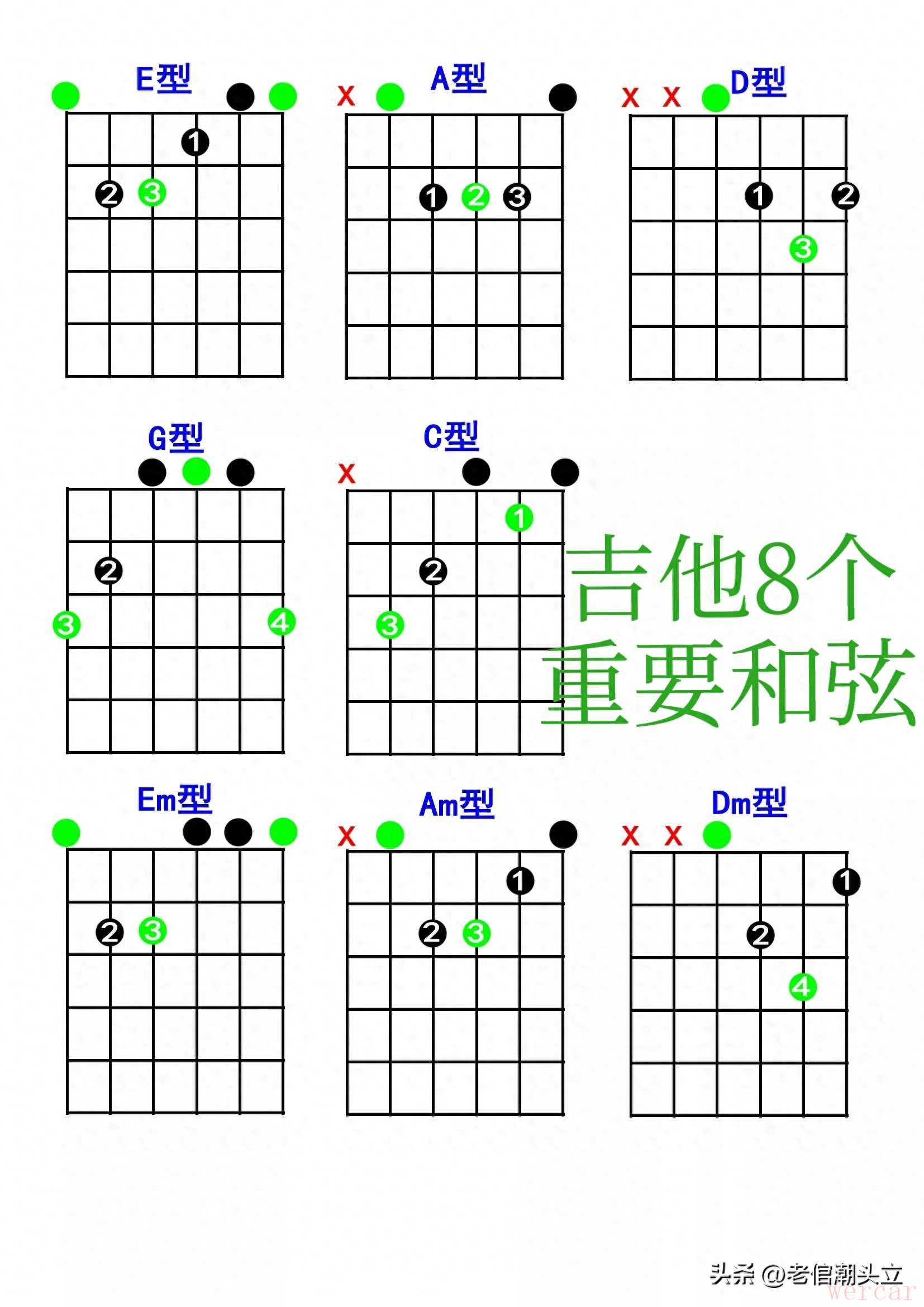 有了学大小三和弦的方向,我们平时练习和弦,就重点放在8种手型的大横和弦练习上,可先入手最好按的E、Em、A、Am大横手型练习,练会这四个,就能玩转十二个调大小三和弦,再把余下的D、Dm、G、C手型大横按练熟,吉他演奏就更得心应手了。