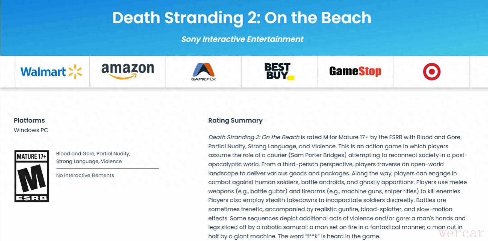 根据美国娱乐软件分级委员会(ESRB)最新公布的信息,《死亡搁浅2:冥滩之上》PC版已正式获得M级(17+)评级,意味着该作品向登陆PC平台又迈进了一步。