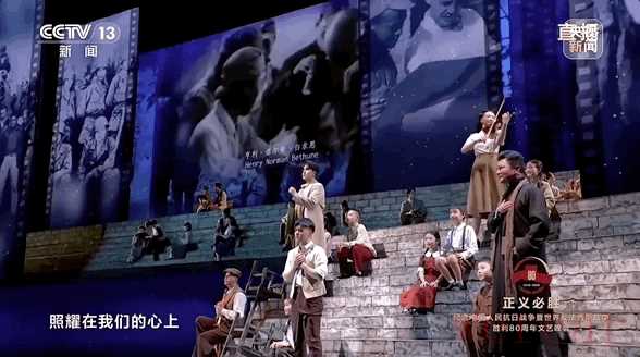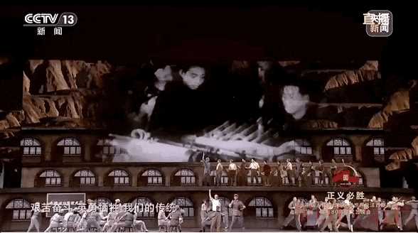晚会中还有不少类似的场景,而这场晚会的一大亮点就是将虚拟舞台背景与历史真实影像相结合。演出背景中呈现的一段段珍贵历史影像,吸引了众人目光,也把大家带回到当时的烽火岁月中。