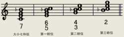 由四个音按照三度关系叠置起来的和弦,叫做七和弦。七和弦各音由下而上称为根音、三音、五音、七音,分别以1、3、5、7标记。