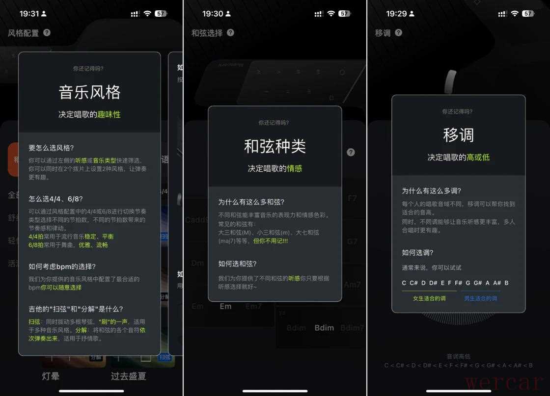 如果你对于音乐知识毫无基础,那么 App 里的注解细节或许能帮你在享受弹唱的同时,让你对简单乐理和吉他有更多的了解。在 App 的许多页面中,我们都能看到一个白色的问号,点击后即可查看当前页面所涉及知识的介绍。比如在移调的界面,我们就能了解到音调的相关知识,在风格配置页面则能了解到不同的弹奏风格如何对歌曲的表现产生影响。