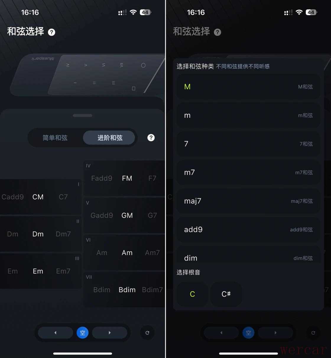 默认情况下,S1 mini 所启用的是「简单和弦」模式,从 1-7 的按钮分别对应各自的基础和弦。如果想要自由地弹奏包括大三和弦、小三和弦等不同的和弦,也可以在 App 首页打开「进阶和弦」功能。进阶和弦的设置不但支持修改和弦种类,甚至也能修改和弦根音,实现更加丰富的效果。每个按键能够分配 3 个和弦。
