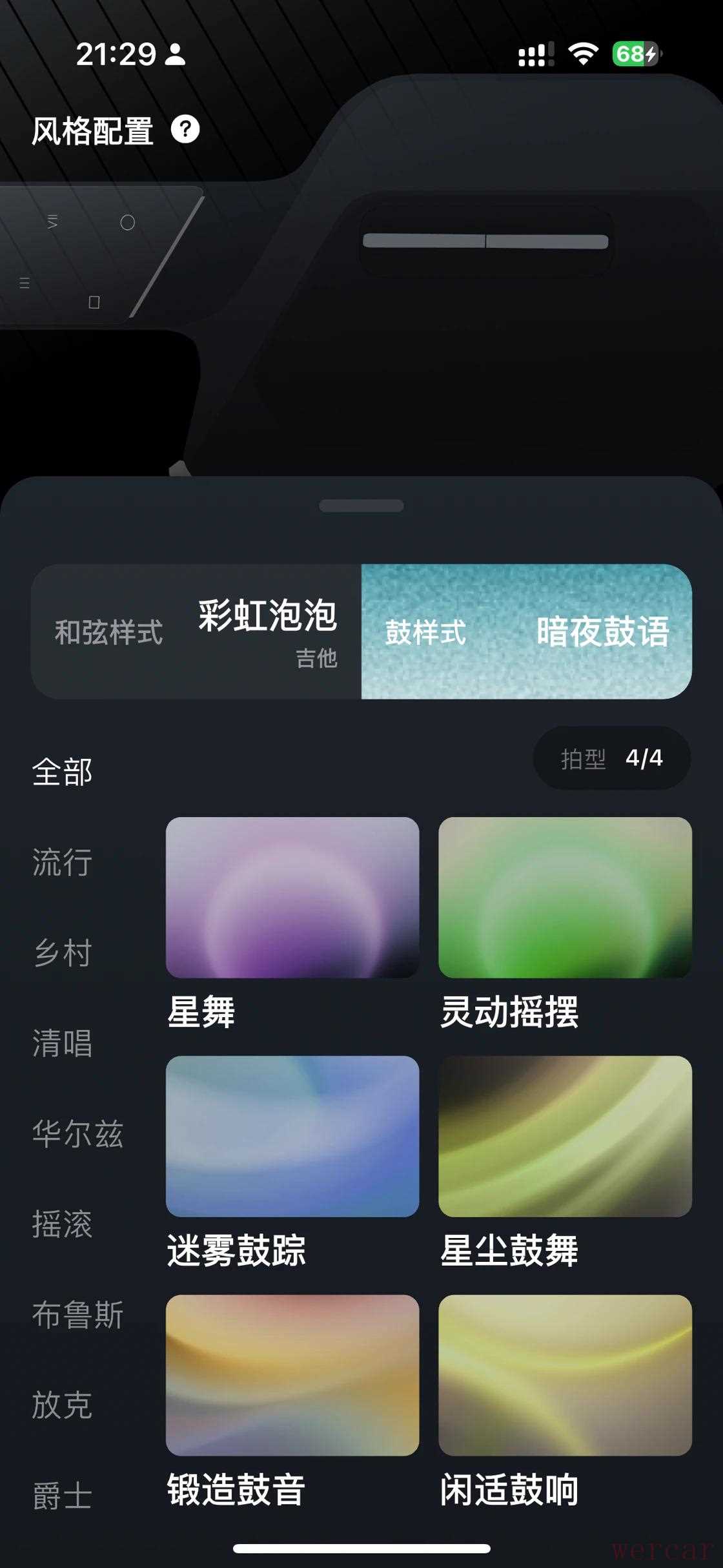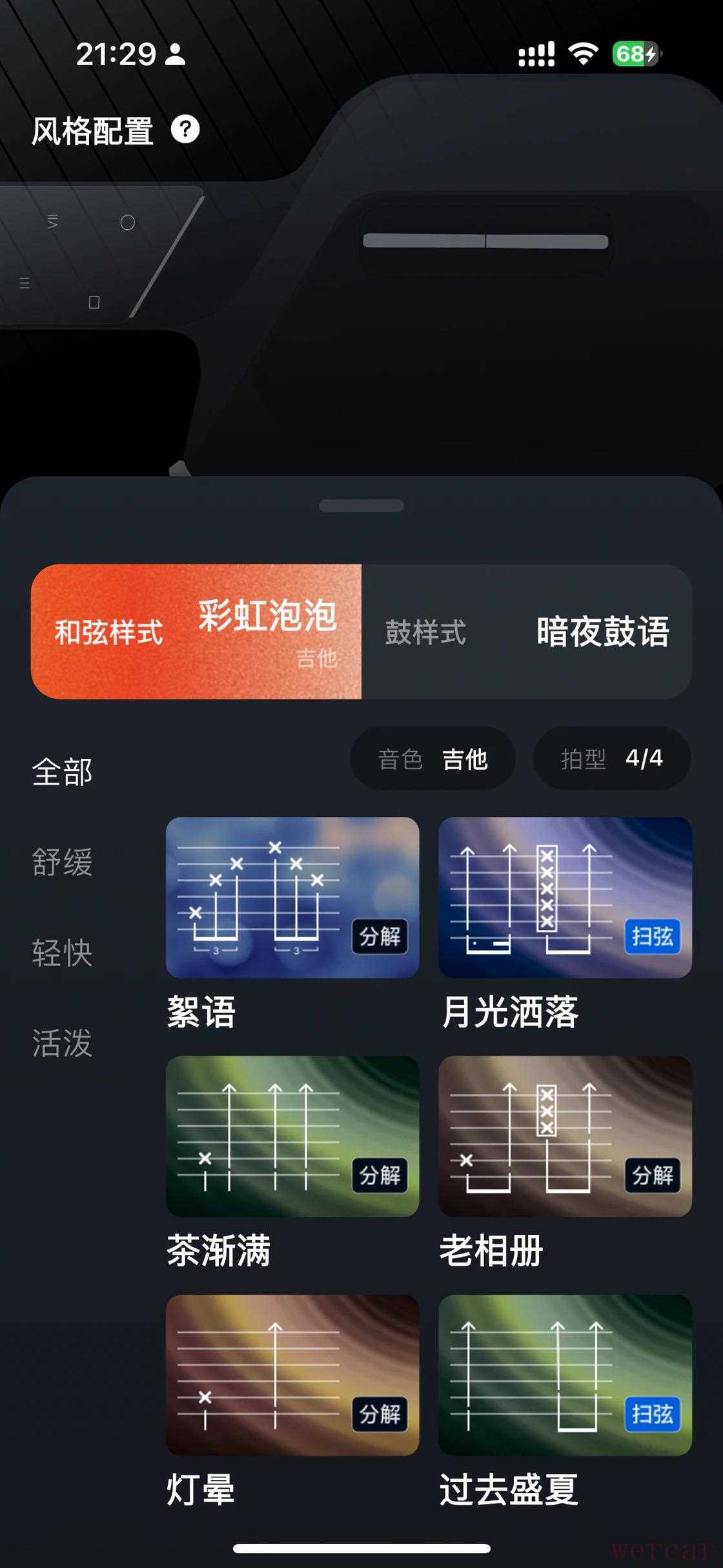 虽然在曲谱中 App 会为你自动匹配不同的和弦与节奏型,但只局限在当前曲谱,如果你想在弹奏中融入自己的创意与想法,或者干脆脱离 App,对照自己找到的乐谱来弹奏,S1 mini 也提供了和弦的更多进阶玩法以供使用。首先,我们可以在 App 主页分别对 2 个拨片的演奏风格进行设置。应用提供了大量不同风格的和弦样式,并且支持修改拍型和音色。有趣的是,S1 mini 甚至还支持模拟钢琴、贝斯和电吉他的音色,可玩性还是很高的。当你想要对照自己的乐谱演奏时候,便可在这里选择合适的风格。