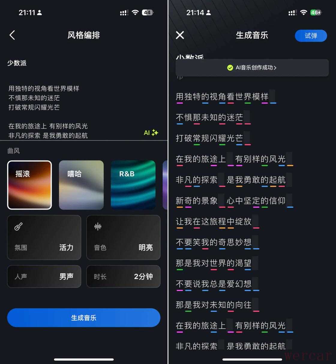 AI 原创则更简单,你只需要填入歌曲标题,然后输入歌词的提示词,点击 AI 按钮即可生成符合要求的歌词。随后根据需求选择想要的曲风、音色等项目,几分钟就能快速生成一首新歌,让你也能轻松享受一把当「唱作歌手」的乐趣。我试着用「少数派」作为关键词让 AI 创作了一首属于少数派的「主题曲」,歌词竟意外地挺贴切的。
