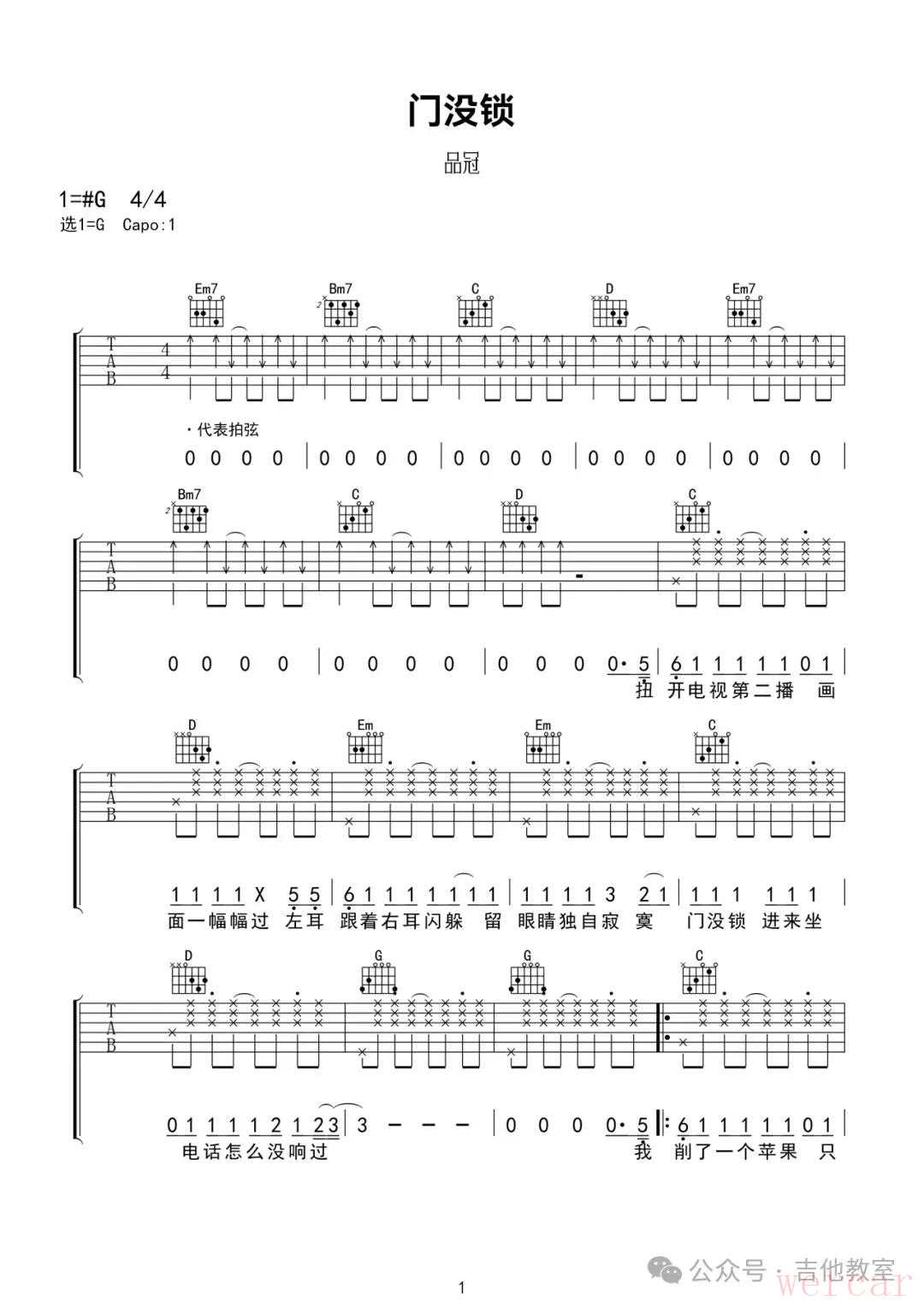 品冠《门没锁》吉他谱