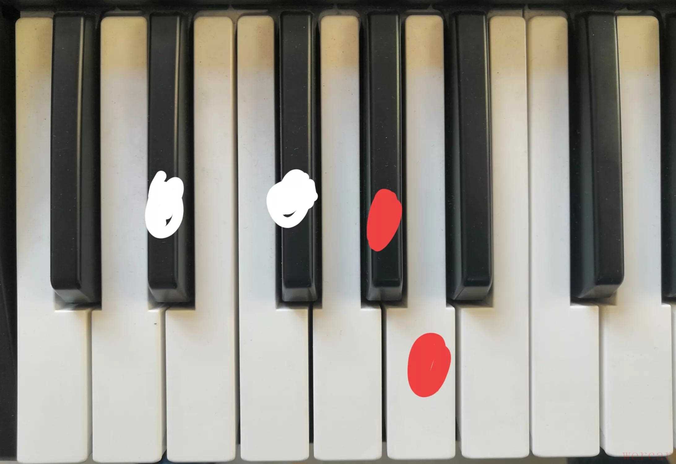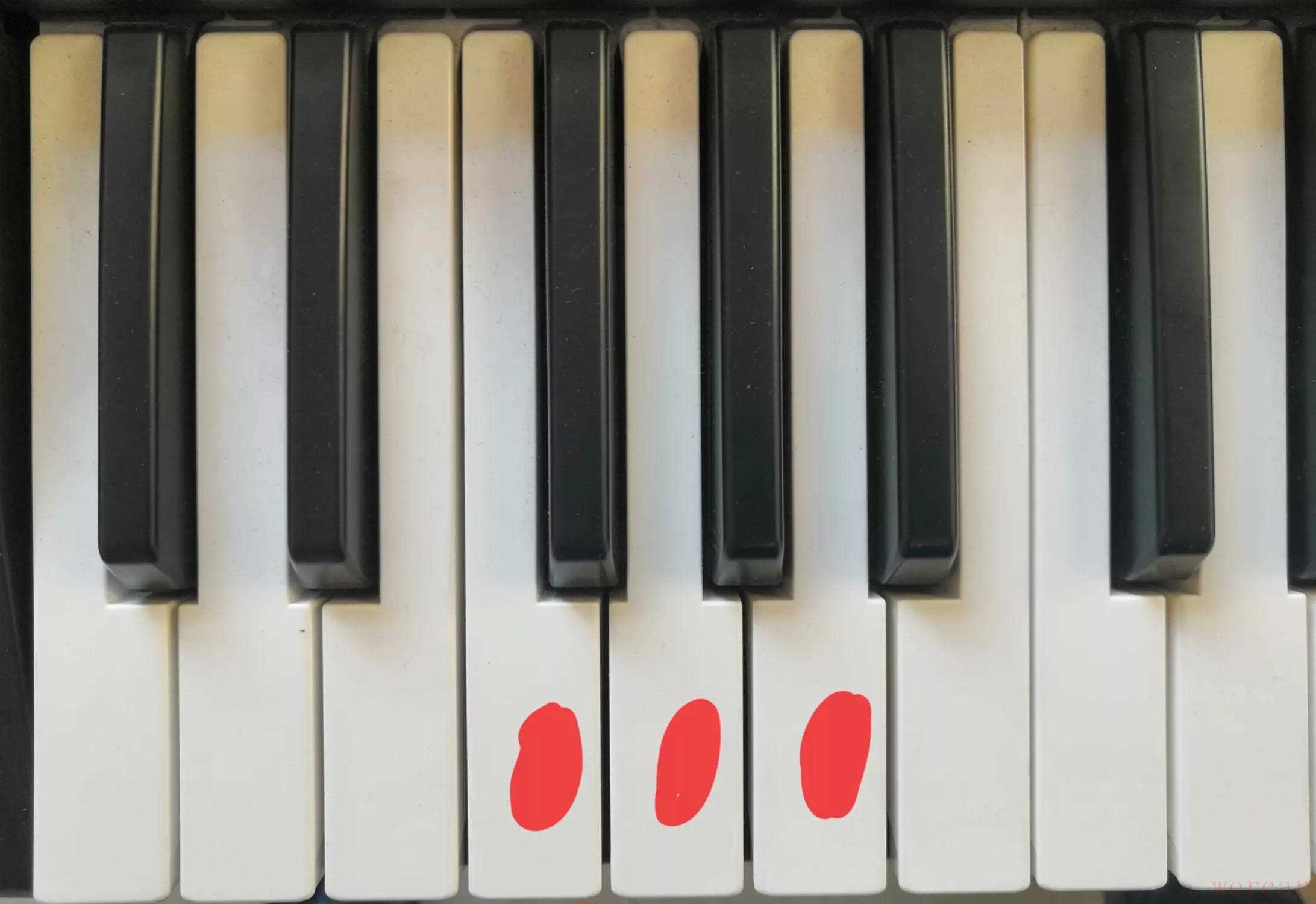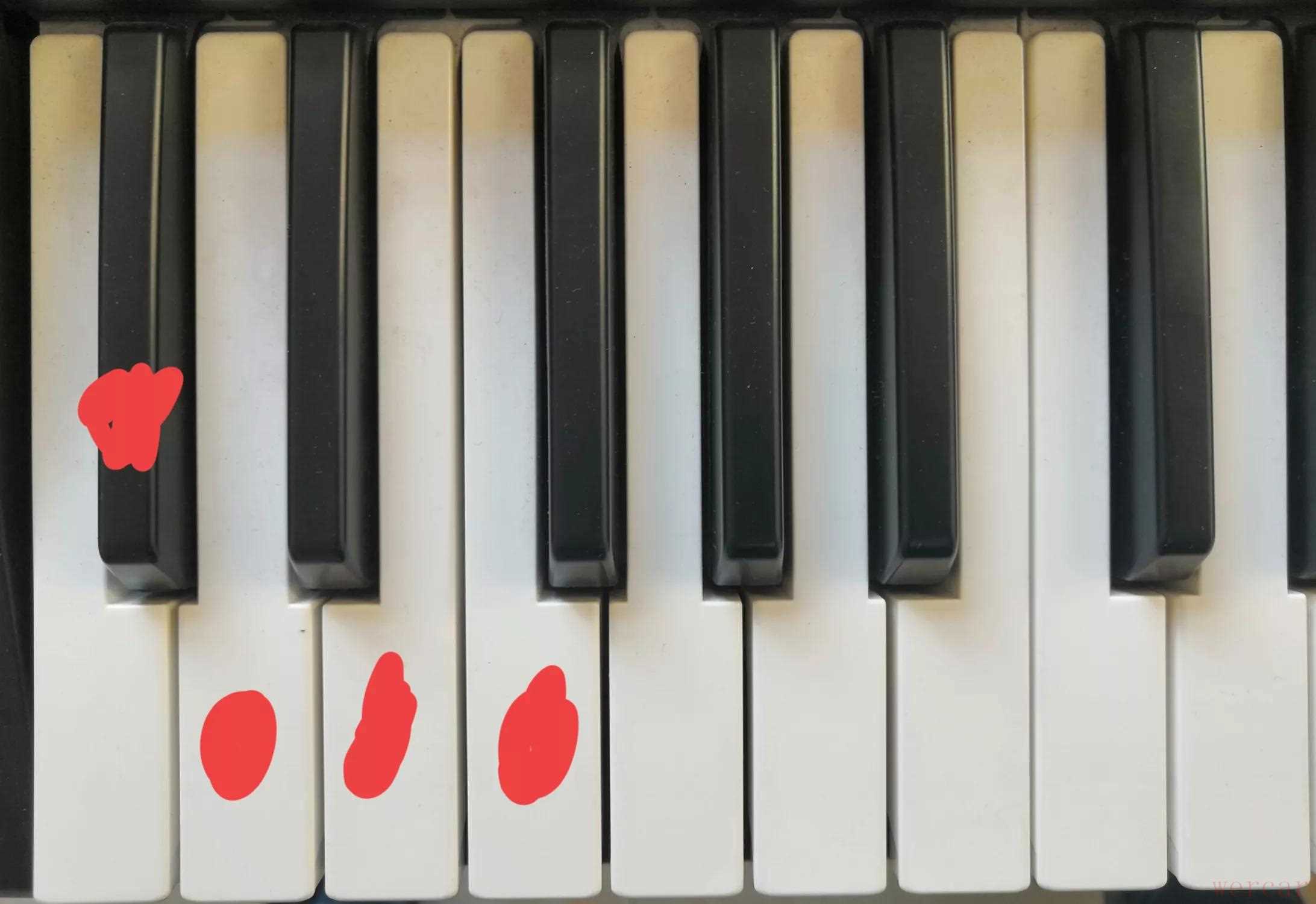 三,如果要弹小三和弦,就要同时弹本音左边的一个黑键,比如要弹“Am”,那就要弹“啦和升梭”,“#Fm”就要弹图中白色标记的二个键,其它和弦方法一样!