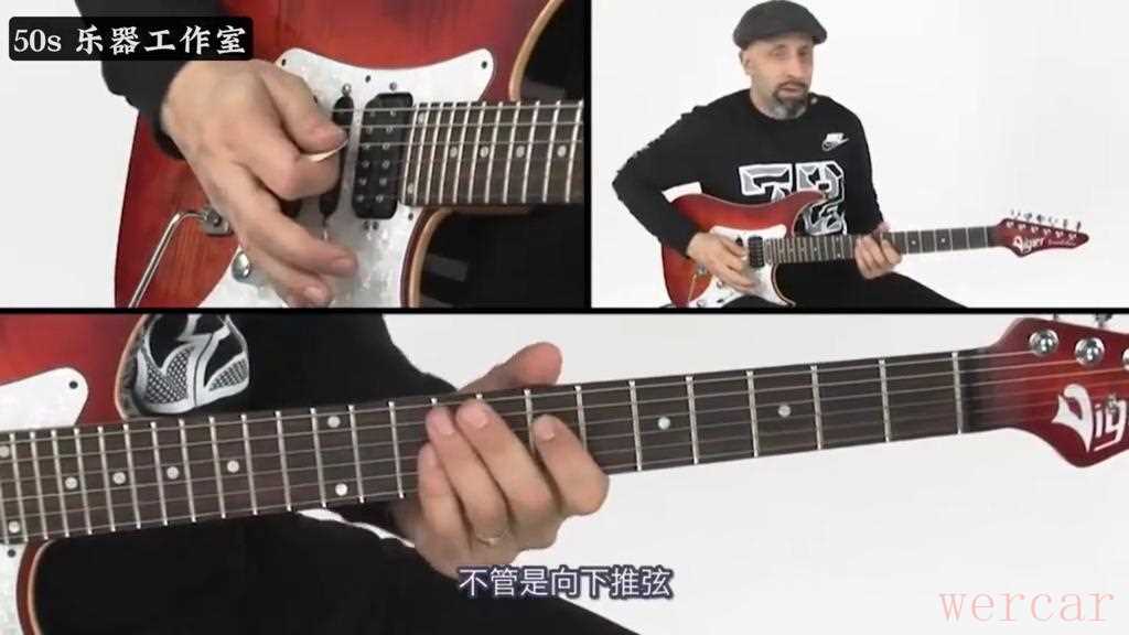 这是一种你可以尽量多用的技巧,我推弦的程度很小,不管是向下推弦或者向上推弦效果都一样。四分之一推弦没必要推准,因为本身也没有四分之一音,半音是一个品,所以我们其实是把音推到初始音和高一个半音的中间,这样听起来就像是人声了。