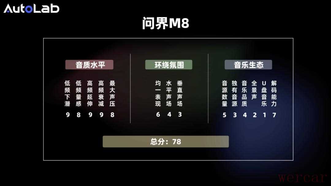 经过我们的实测,问界M8在AudioLab 2.0的评分标准中获得了78分的总成绩。