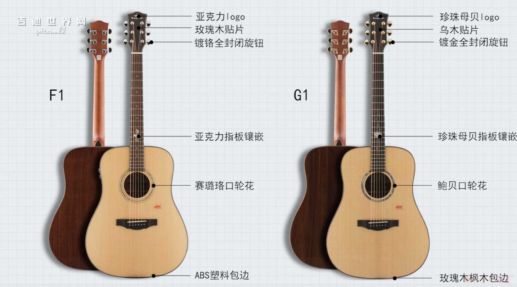 从琴头开始,G1的琴头logo使用的是珍珠母贝,而F1则是亚克力;2mm的琴头实木贴片,G1使用的是乌木,F1则是玫瑰木。F1仍使用台湾宾玮出品的弦钮,只是从G1镀金全封闭,变为镀铬全封闭。指板的装饰镶嵌,G1为珍珠母贝,F1为亚克力;音孔的口轮花,G1为鲍贝,F1为赛璐珞。共鸣箱处的镶边,G1为玫瑰木+枫木,F1则为ABS塑料。