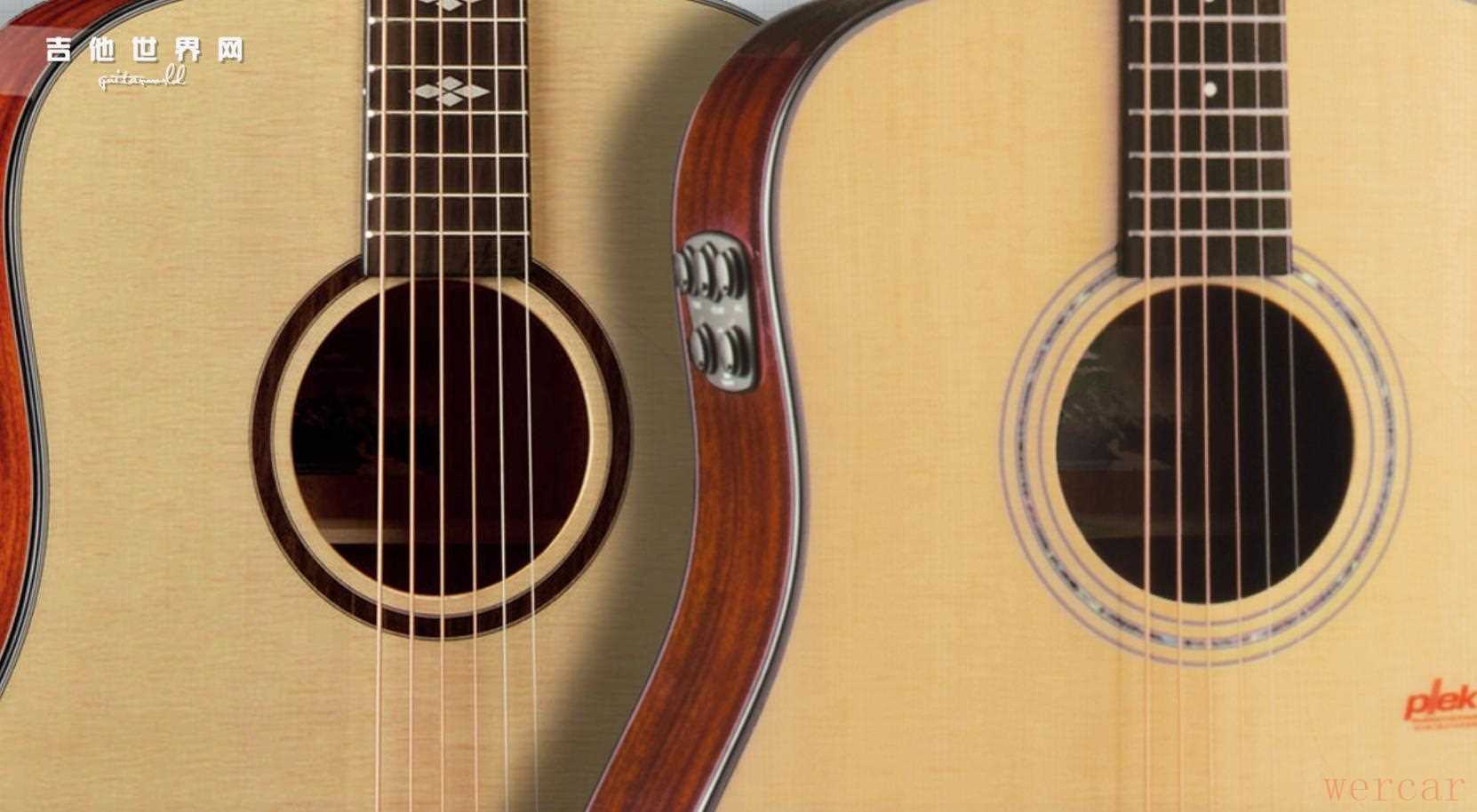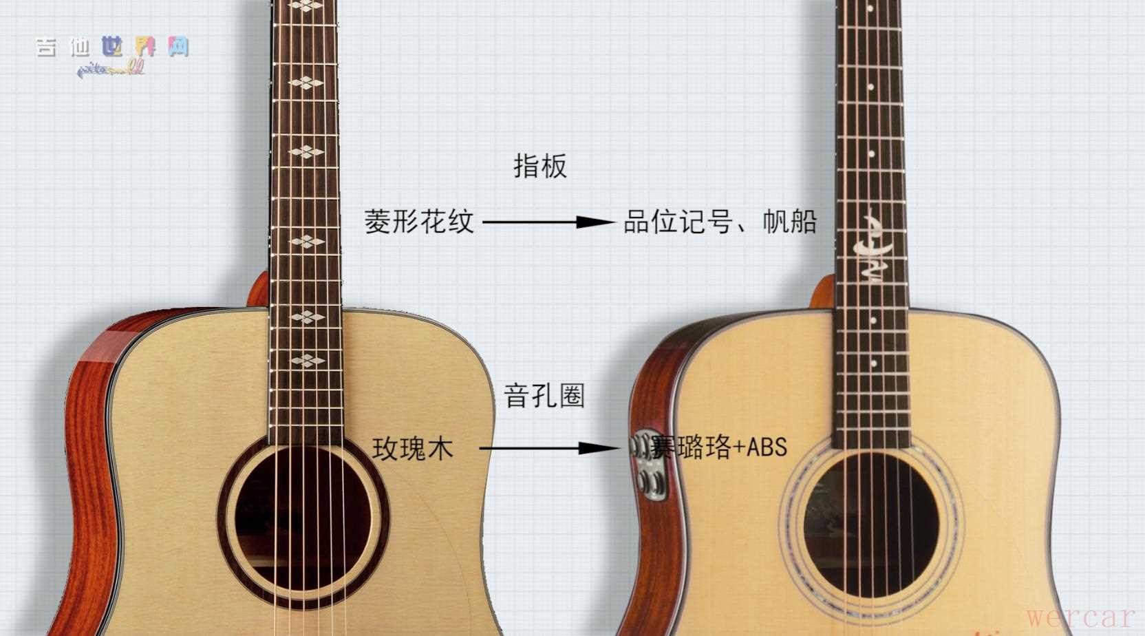 一个是指板的菱形花纹变成了品位记号+帆船,一个是音孔处的玫瑰木实木镶嵌,变成了赛璐珞+ABS。