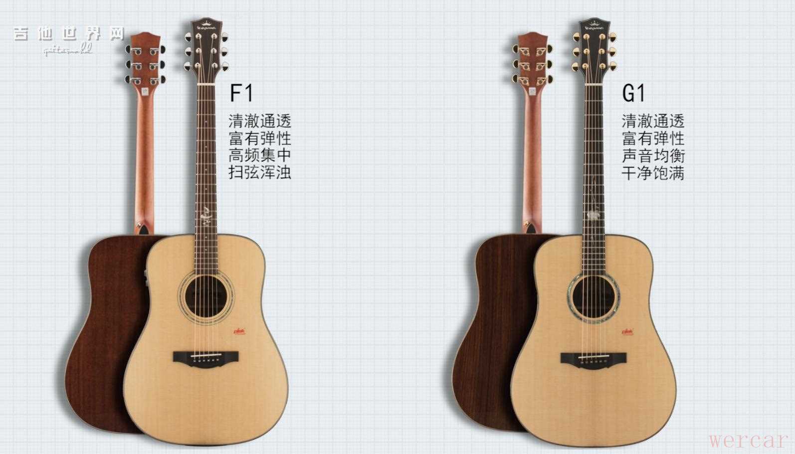 将G1与F1放在一起,我们可以发现F1仍保留了G1的一些音色特点:通透、清澈、富有弹性。不过,在声音的均衡度上,G1的表现要优于F1,G1不论是低音还是高音,声音都干净而饱满,颗粒分明;F1则在高频段更为集中,但扫弦有些浑浊,层次感稍显欠缺。