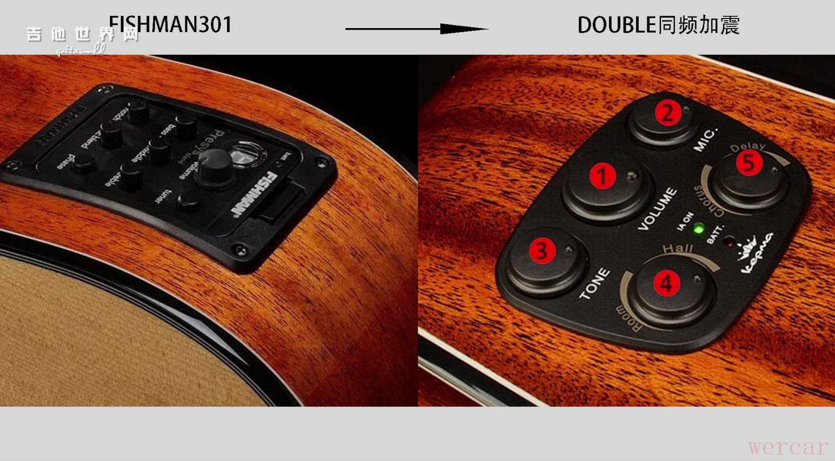 另外,F1的拾音器也从最开始配备的fishman 301,替换为了与Double合作开发的同频加振拾音器,加了拾音器的电箱款F1E-D售价为3200元。