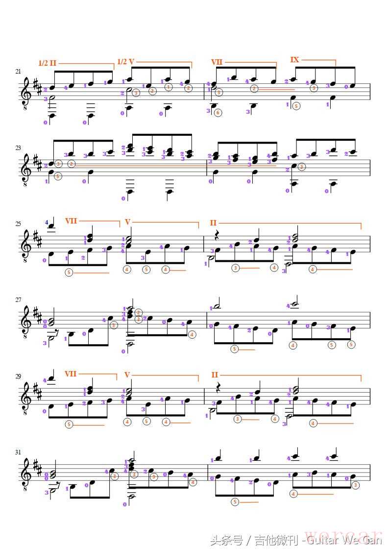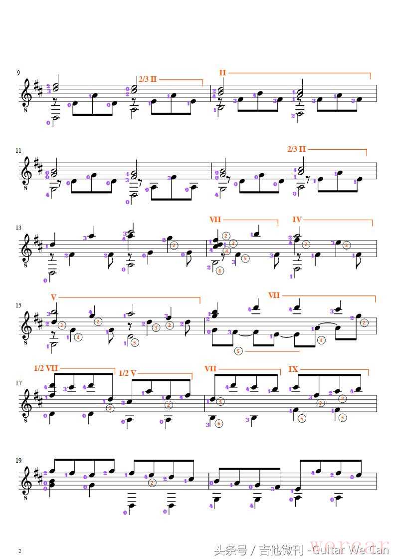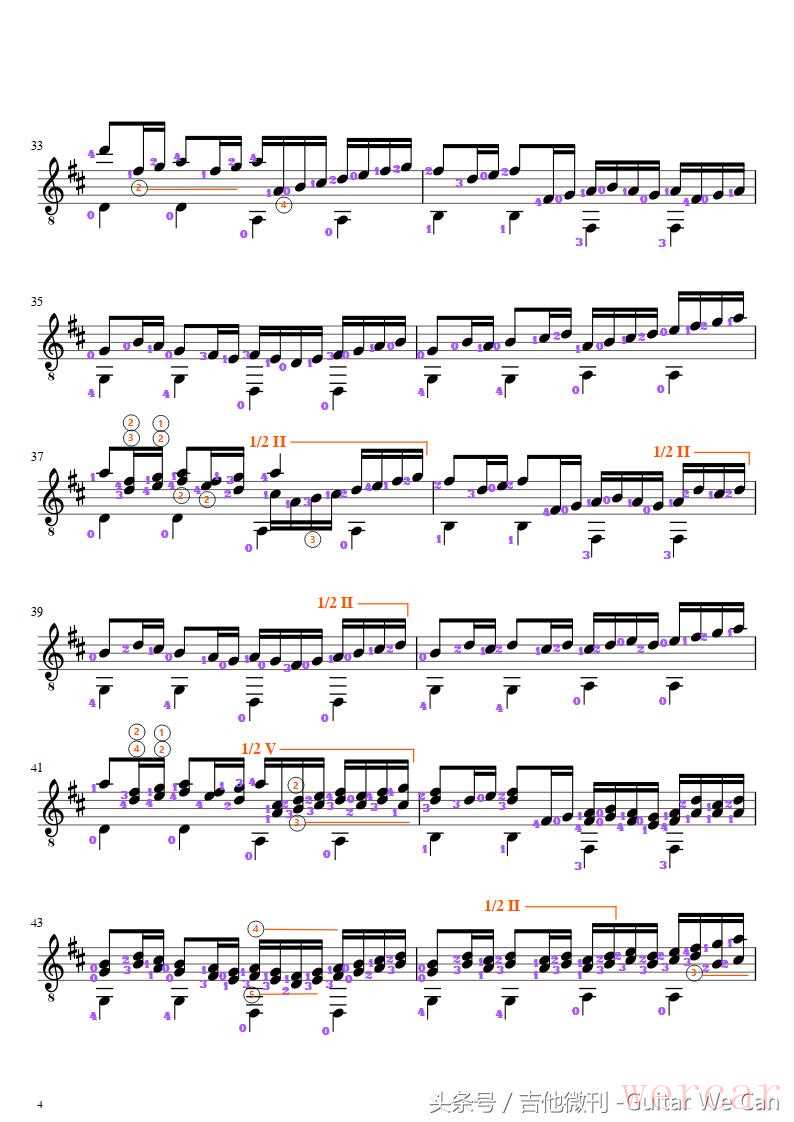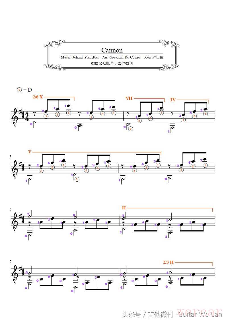 Cannon in D 的古典吉他改编版本有很多,Chiaro 的改编在复调声部方面比较有特色,但是演奏难度也较大。尽管谱面看上去貌似简单,但是大量的左手横按、高把位双音、频繁的把位转换,同时还要兼顾各声部间的平衡关系……,演奏起来还是有一定挑战性的。因此,也许是疏于练习的的缘故,即使是改编者本人在视频中省略了不少内容的情况下,演奏的也不是十分完美(收听全乐谱声音效果请通过微信访问该曲的动态乐谱演示)。
