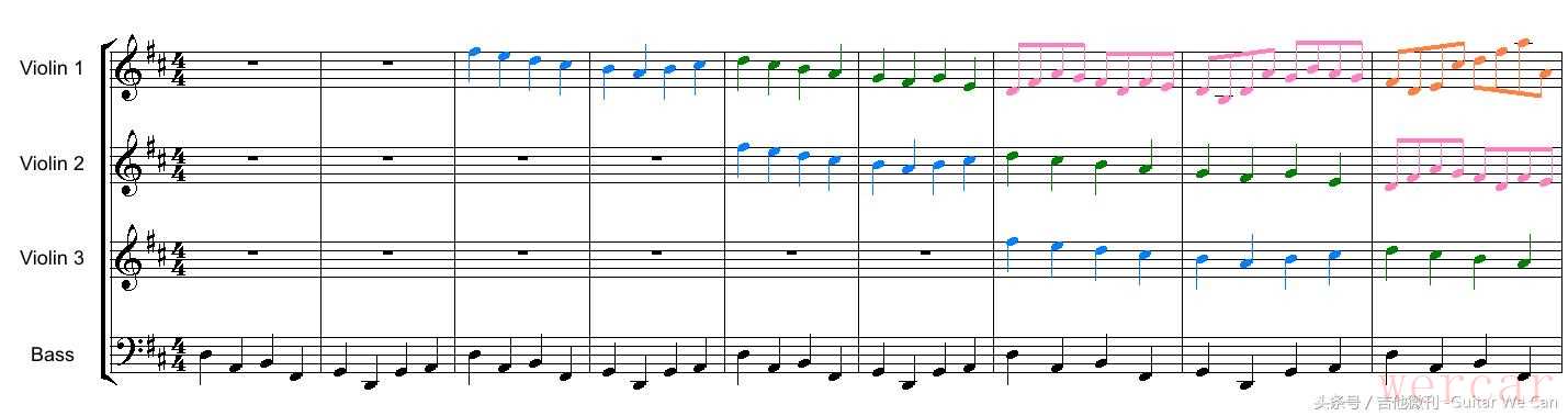 关于卡农的创作手法及作品分析网上已经有大量文章,诸如:三把小提琴以同样的旋律、同样的间隔相继进入、大提琴声部从头至尾都在演奏相同的两小节、八个音,反复了28次……等等,本人在此就不再赘述。只是希望大家清楚一点,由于上述特性,Cannon in D 这首乐曲是任何一种原声乐器都不可能以独奏的形式完全再现的,所谓的独奏版只能看做是“卡农主题的轻音乐”。