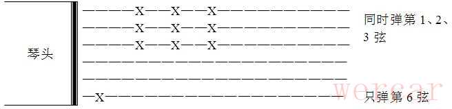 在六线上画“X”,此时六线谱上方往往有关于左手按和弦的指法图或标记表示。那么你就用左手按好和弦,“X”表示用右手指弹响其所在的弦。