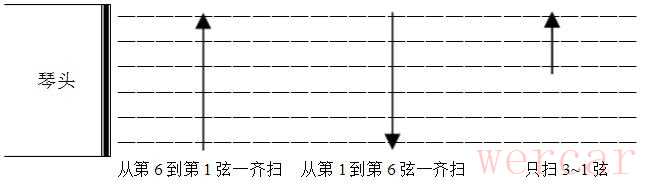 在六条线上画“↑”、“↓”等符号,此时六线谱上方也往往有关于左手指法的提示。有时候,上述几种记谱法会在同一首六线谱中出现。