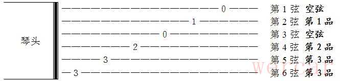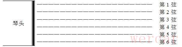 吉他从下往上依次是1、2、3、4、5、6弦,六线谱是把吉他的六根弦对应划出六条平行横线来表示两只手演奏的位置和动作,不记录音的高低。六线谱从上往下依次对应吉他1、2、3、4、5、6弦。