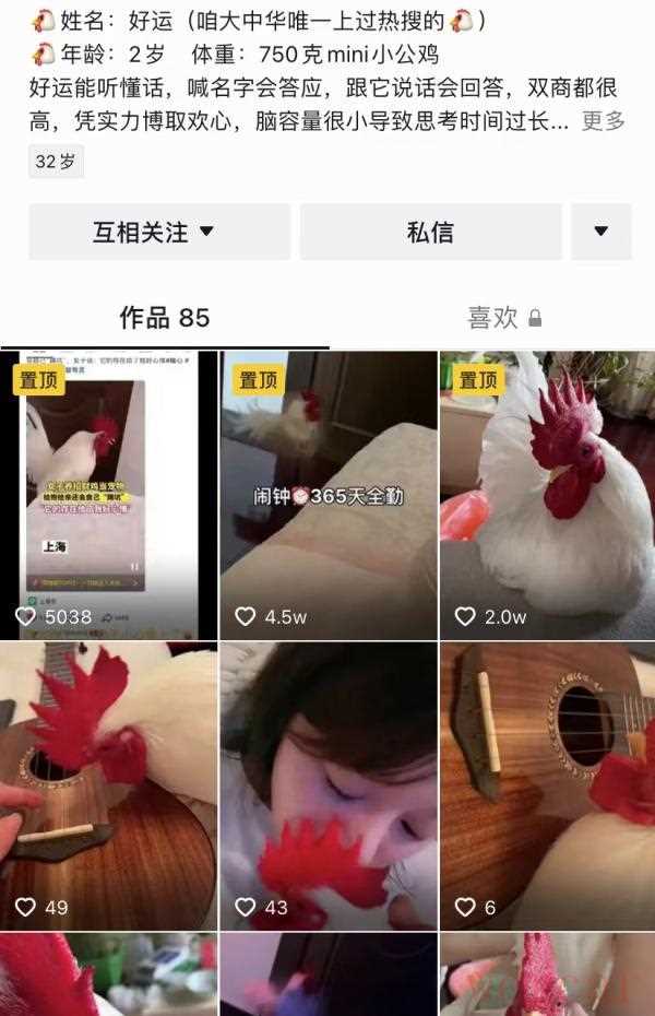 相对于常见的公鸡,“好运”只有鸽子般大小的身型,体重750克,尾巴犹如凤凰羽翼,模样俊美可人。“‘好运’刚被带回家时,还被关在笼子里养,但随着每天的朝夕相处,越来越亲密,我看到了它可爱的一面,和它在一起,我感受到了无限的快乐,它也带我打开了一扇新世界的大门,让我对鸡有了新的认知。”她说,“好运”缓解了自己的抑郁症。她每天都记录她和“好运”的生活点滴,还上了热搜。