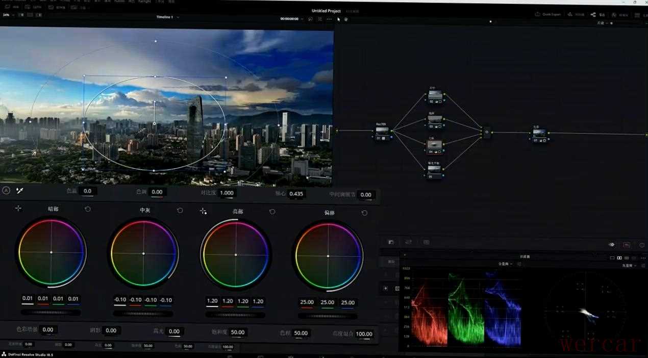 ·选中第四个节点,接下来就是拍摄主体了,这个画面的主体其实就是画面的中央部分,所以选中蒙版,新建一个圆形,调整形状和渐变,覆盖中间的云彩和大楼,把过渡调的更自然,然后拉低中灰,同时拉高高光,让云彩和楼宇更加鲜亮。看看调整前后的对比,局部调整了中心部分之后,整个画面的重点就明确了很多。