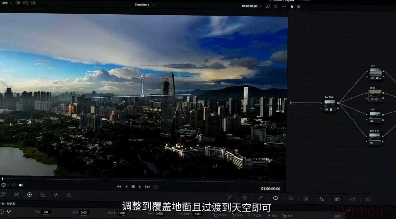 ·选中第三个节点,来调整地面,同样点击蒙版,选中渐变蒙版,拖到画面下方,调整到覆盖地面且过渡到天空即可。调高中灰,把地面楼宇的曝光找回来。为了让天空更显眼,这里地面的亮部和暗部都可以稍微压一点,可以看到调之前是上亮下黑的,调完之后整个画面的曝光更和谐了。