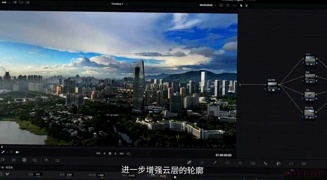 ·最后选中第六个串形节点,来调整色彩,之前已经拉高了对比和饱和度,这里可以再拉高,中间调细节,进一步增强云层的轮廓,然后调整一下色温和色调就可以了。如果想要做一些风格化,比如橙青色调,可以在这里把亮部往橙色拉一点,把暗部往青色拉一点。