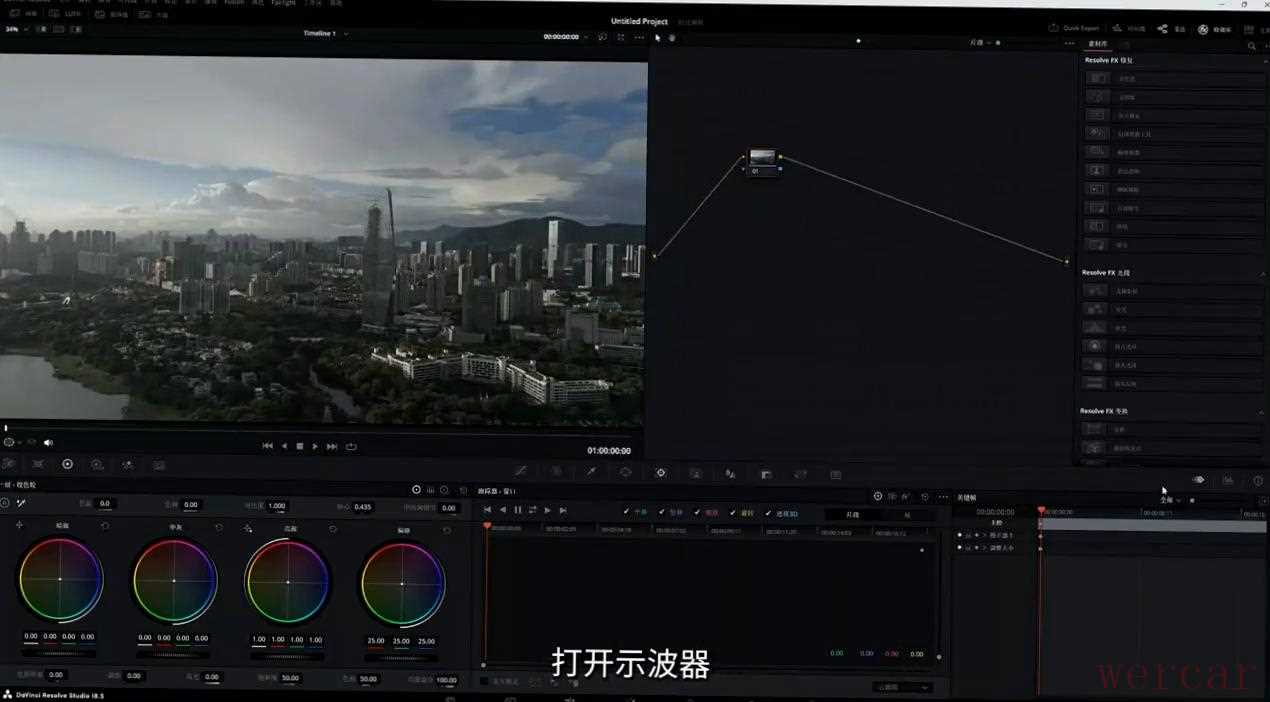 ·然后进入调色面板,调整一下界面,打开示波器,这里会主要看RGB分量和矢量图多一点。