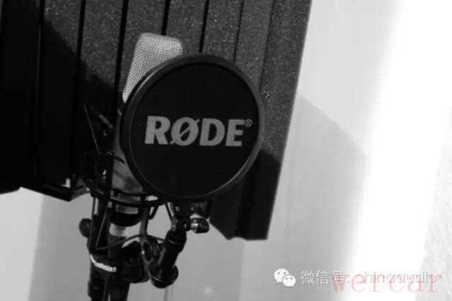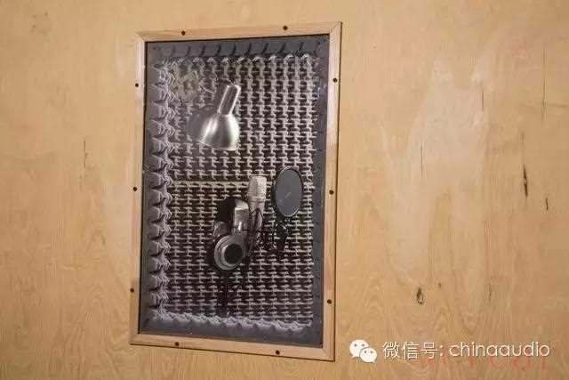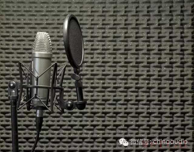 加了防震架和防喷罩的电容话筒,在一个背后有隔音板的隔音房间里